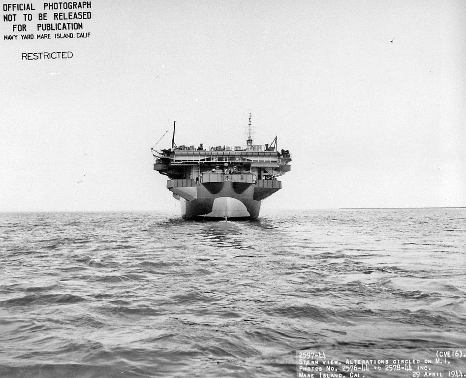 151k | Stern view of USS Nassau (CVE-16) departing Mare Island on 29 April 1944. Official Mare Island photo # 2597-44. |