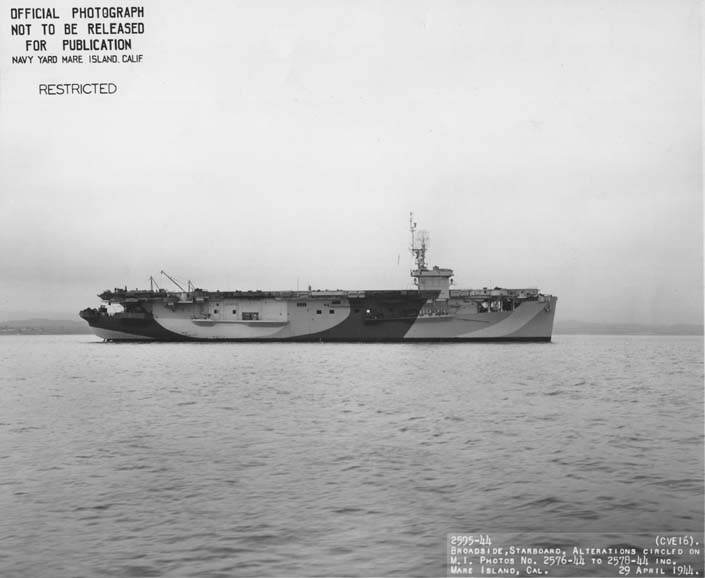 484k | USS Nassau (CVE-16) wearing Measure 33 Design 2A, 29 April 1944, at Mare Island, California. Photo source: National Archives and Records Administration (NARA), # BS 65105. This is also official Mare Island photo # 2594-44. |