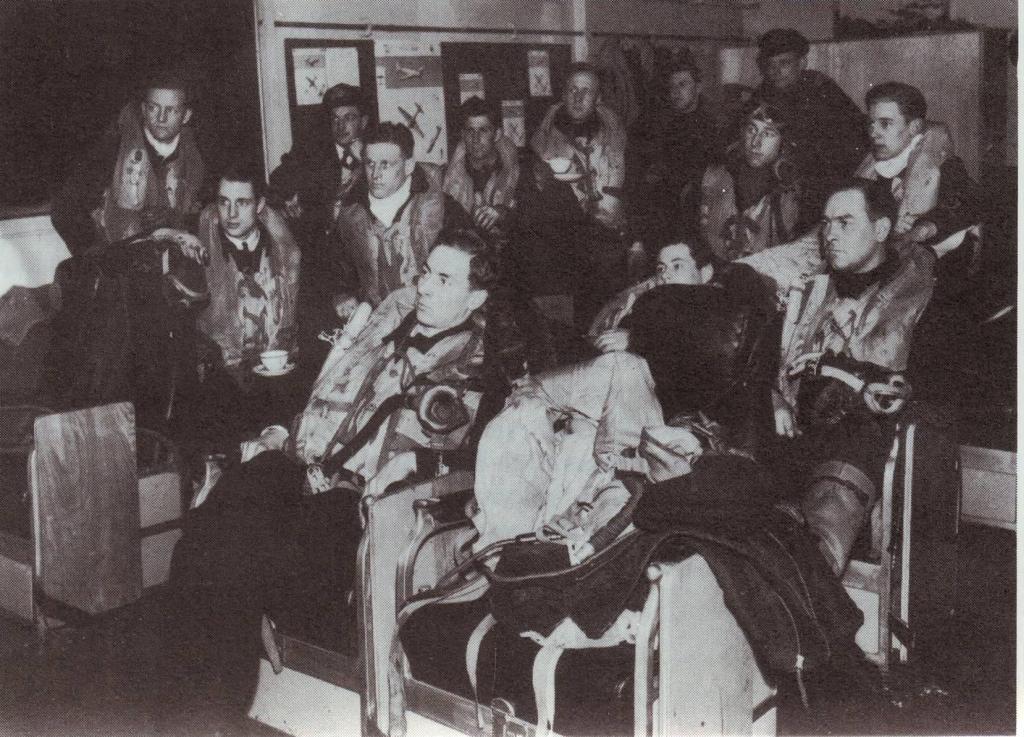 134k | FAA crewmen in the briefing room aboard the escort carrier HMS Pursuer. Photo and text from The British Aircraft Carrier, by Paul Beaver. |