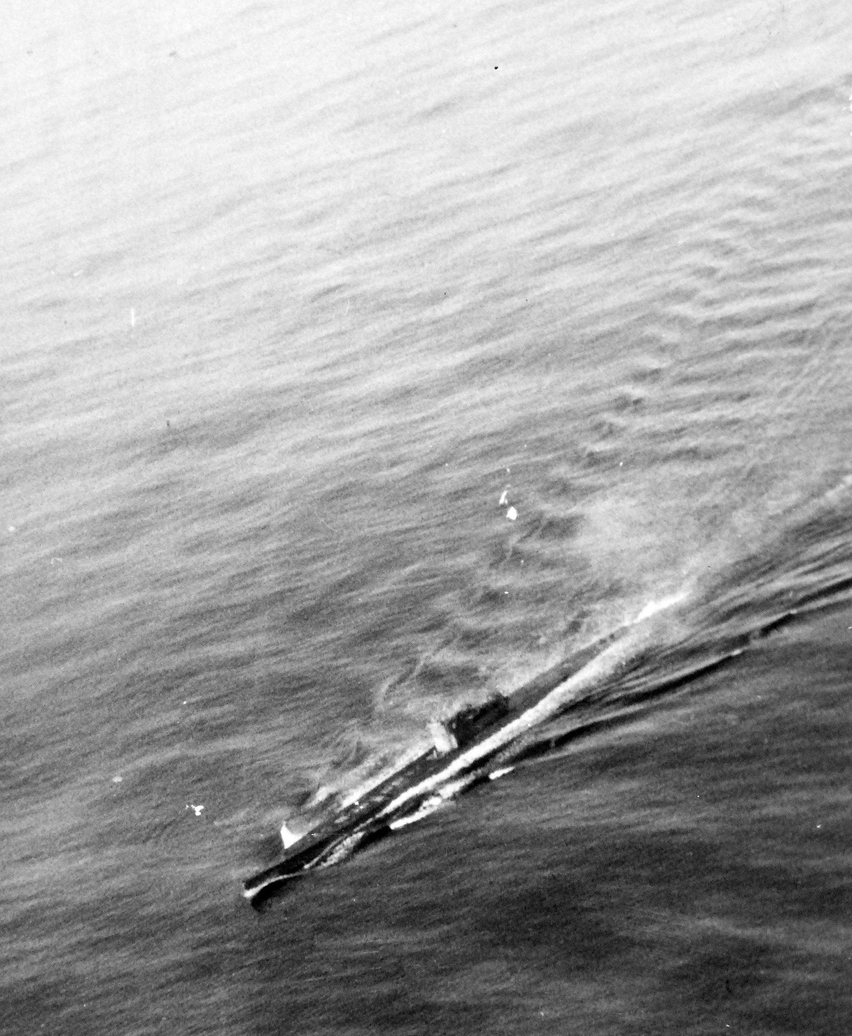 107k | German submarine U-801 sinking with bow high, in position 16 41N, 29 58W on 17 March 1944. USS Corry (DD-463) is coming up at right. The submarine was sunk by aircraft and surface ships of the USS Block Island (CVE-21) group. Photographed from a TBM Avenger aircraft of squadron VC-6, based on Block Island. Official U.S. Navy Photograph, now in the collections of the National Archives (# 80-G-222850). |