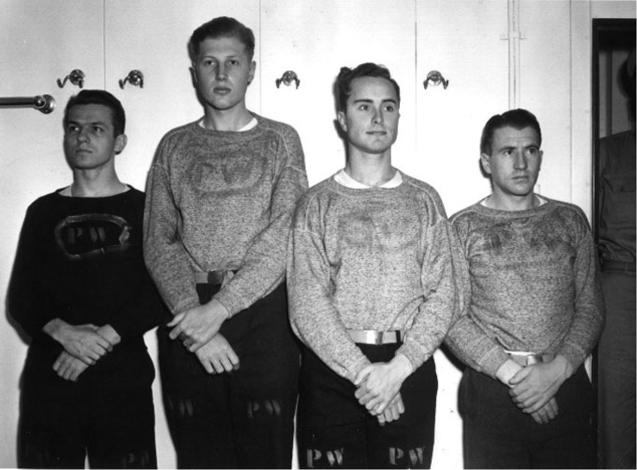 136k | German submarine U-801, Prisoners of War aboard USS Block Island (CVE-21). NS0302105b: Officers. Left to right: Oberfunkmeister Ernst Freudig; Leutnant Fritz Buschmann, First Watch Offcier; Leutnant Günther Kempkes, Second Watch Officer; Stabsobermaschinist Karl Ernst Paustian. NS0302105c: Petty Officers on the forecastle. NS0302105d: Enlisted men on the forecastle. |