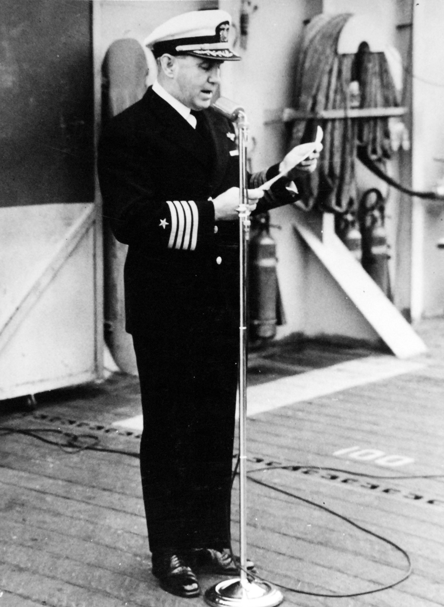 514k | Captain Francis Massie Hughes, USN, accepting command of USS Block Island (CVE-21), 10 March 1944. National Archives and Records Administration (NARA), photo # 80-G-49301. |