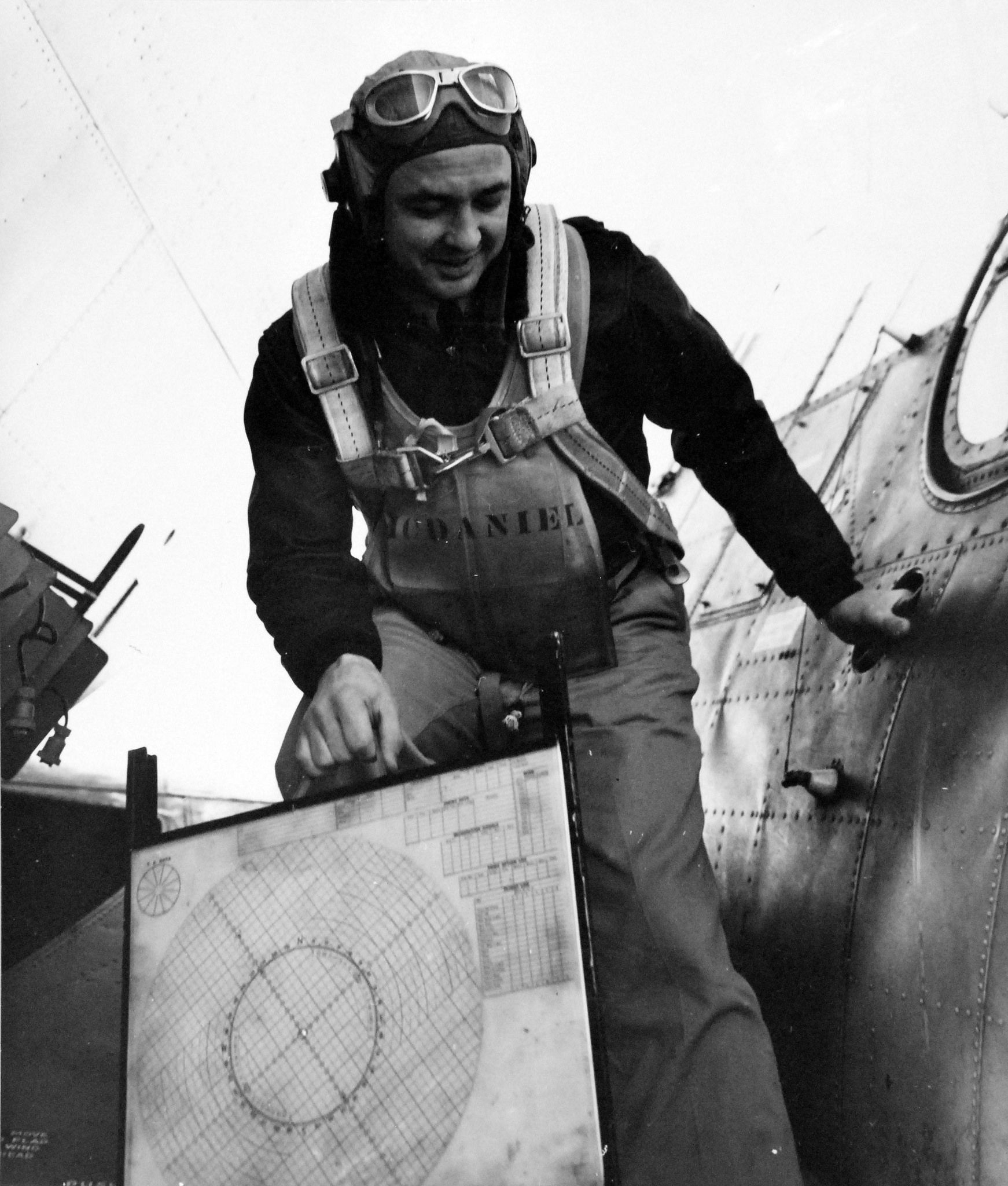 397k | Lieutenant James G. McDaniel, USNR, who was forced to make a water landing when his escort carrier, USS Block Island (CVE-21), was sunk. LT McDaniel was rescued by a DE. He climbs from the cockpit of his plane after a routine trip. Photograph released 29 May 1945. Official U.S. Navy Photograph, now in the collections of the National Archives and Records Administration (NARA), # 80-G-49306. |