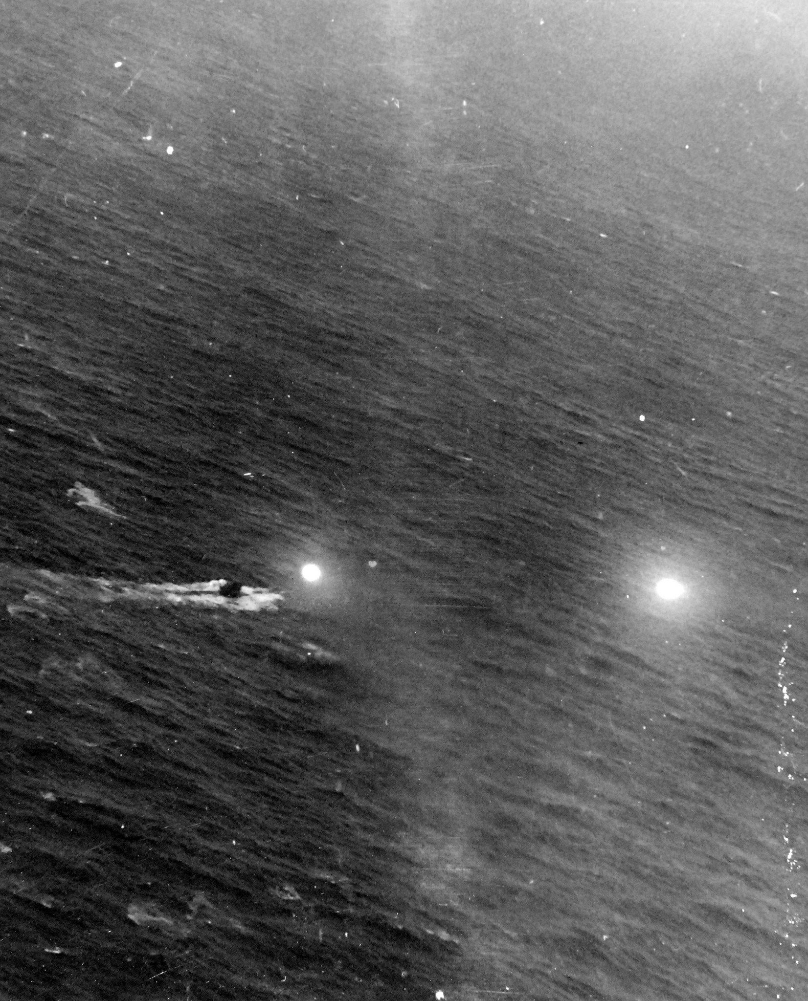 147k | German Type XB submarine U-220 was attacked and sunk by aircraft from Composite Squadron (VC) 1, off USS Block Island (CVE-21), on 28 October 1943. NS0302116: Sketch showing tracks of U-Boats relative to position from which pictures were taken. From VC-1 ASW-6 report 9-43, Enclosure E. "There were six photographs taken of the depth bombing attack and one of the mine attack. The radioman used a K-20 camera to obtain these, the first six being taken out of the port window by the radioman's seat in the TBF tunnel and the seventh from stinger gun position (the [gun] having previously been removed) while lying prone. The negatives from the gun cameras of the fighter and TBF turret are forwarded. The TBF turret film does show the water and some indistinct objects. Obviously the range is great and with the limited facilities aboard ship, nothing of definite value can be found. Perhaps further study of this short strip will disclose further facts." NS0302116a: "U-220 and U-256 under attack by aircraft from USS Block Island, October 28, 1943. U-256 is visible to the left in the photo and U-220 is in the center with DB swirl visible aft of the U-boat. This photo is of poor quality but it is the only one that shows both boats." NS0302116b: "FIDO splash 100 feet beyond the swirl 45 seconds after U-256's conning tower disappeared. The FIDO made a turn to port after it entered the water and disappeared from view. No shock wave was observed." NS0302116c: "To left center can be seen the larger submarine showing what