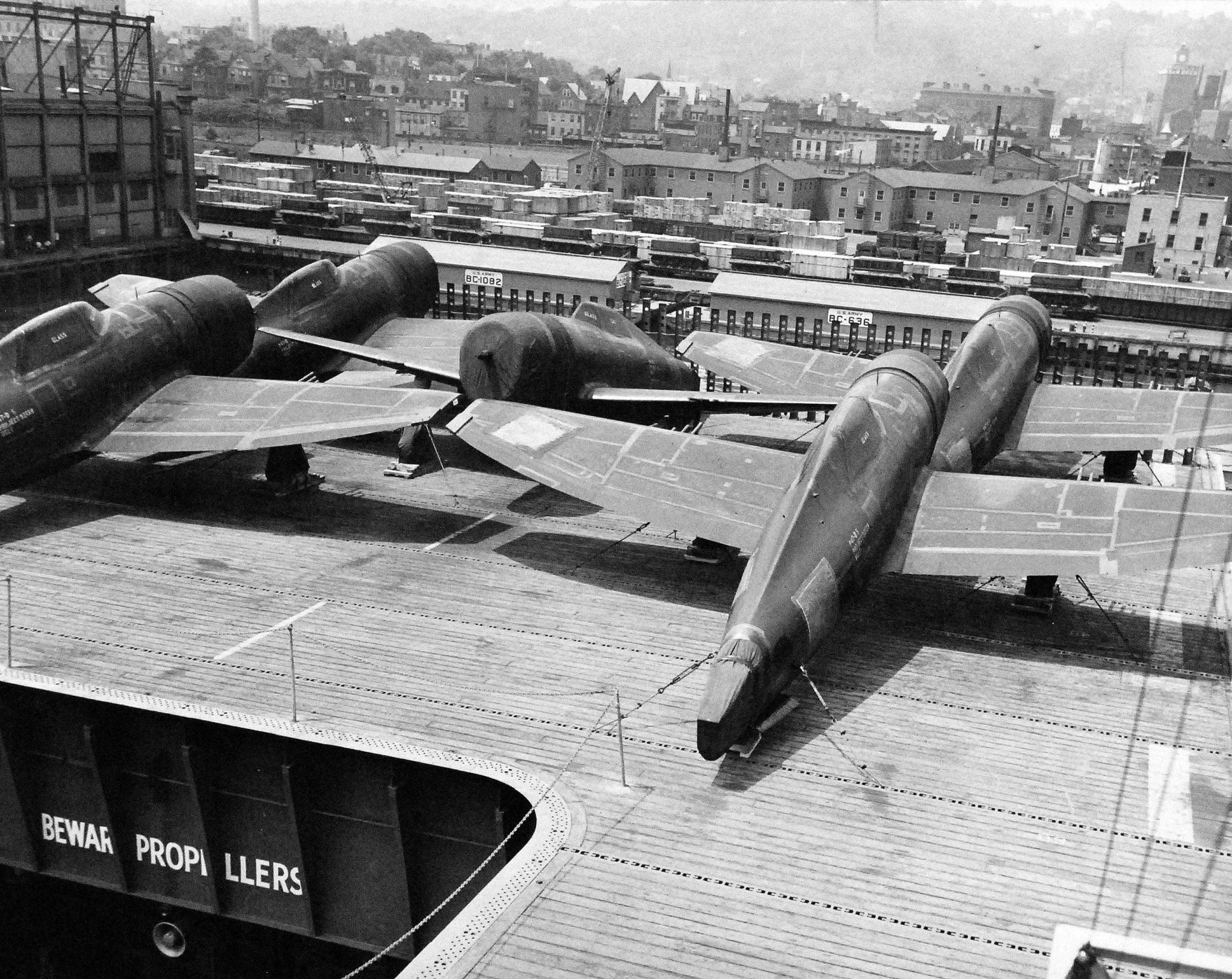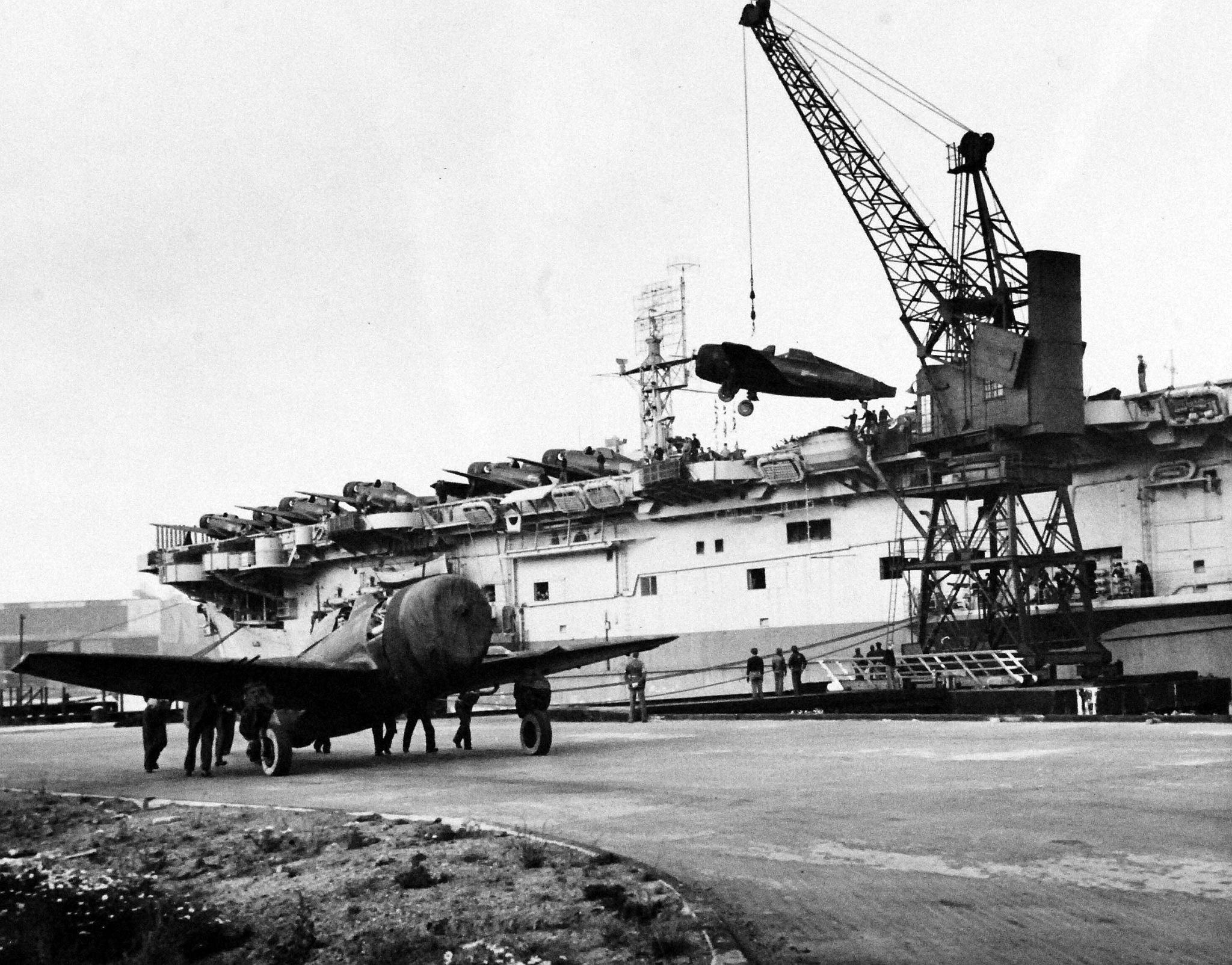 691k | Unloading P-47 Thunderbolts from USS Block Island (CVE-21) at Belfast, Northern Ireland, 27 July 1943. National Archives and Records Administration (NARA), photo # 80-G-77757. |