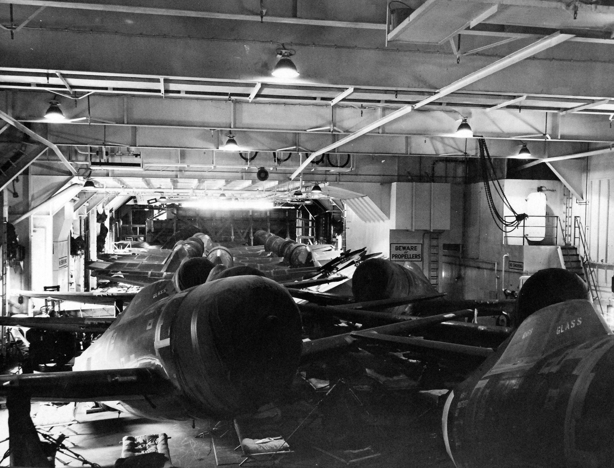 637k | Hooded planes and stores on the hangar deck of USS Block Island (CVE-21). Taken from the after elevator looking forward, 15 July 1943. National Archives and Records Administration (NARA) photo, # 80-G-77754. |