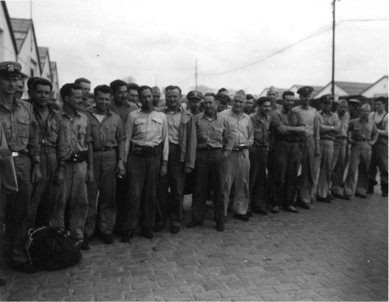 433k | Survivors of USS Block Island (CVE-21), Casablanca, Morocco. Executive officer, Commander Delos Edwin Wait. Photographed by L.F. Cirzan (USS Bogue (CVE-9)), 1 June 1944. Official U.S. Navy Photograph, now in the collections of the National Archives and Records Administration (NARA), # 80-G-266505. |
