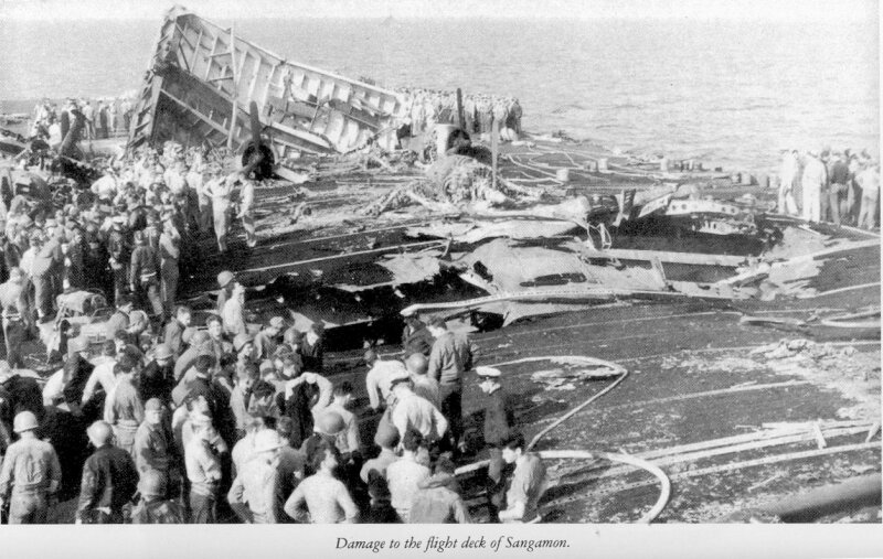 111k | Damage to the flight deck of Sangamon after a kamikaze attack, May 1945. | Joe Radigan | |