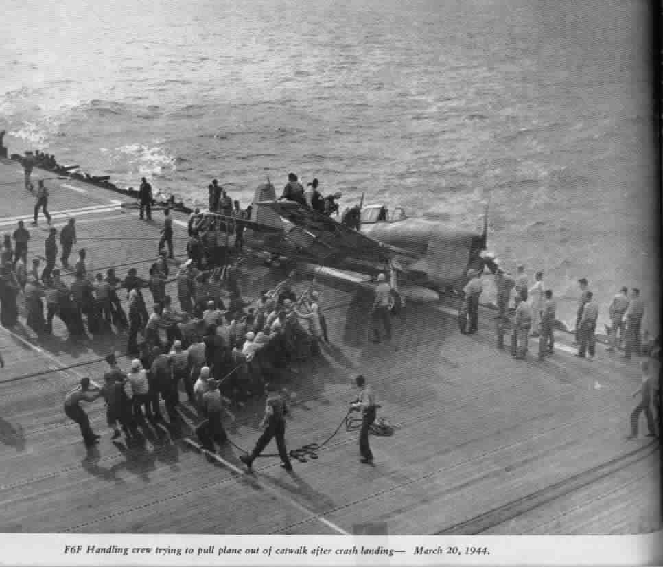 40k | F6F handling crew trying to pull plane out of catwalk after crash landing; March 20, 1944. | Don Schroeder | |