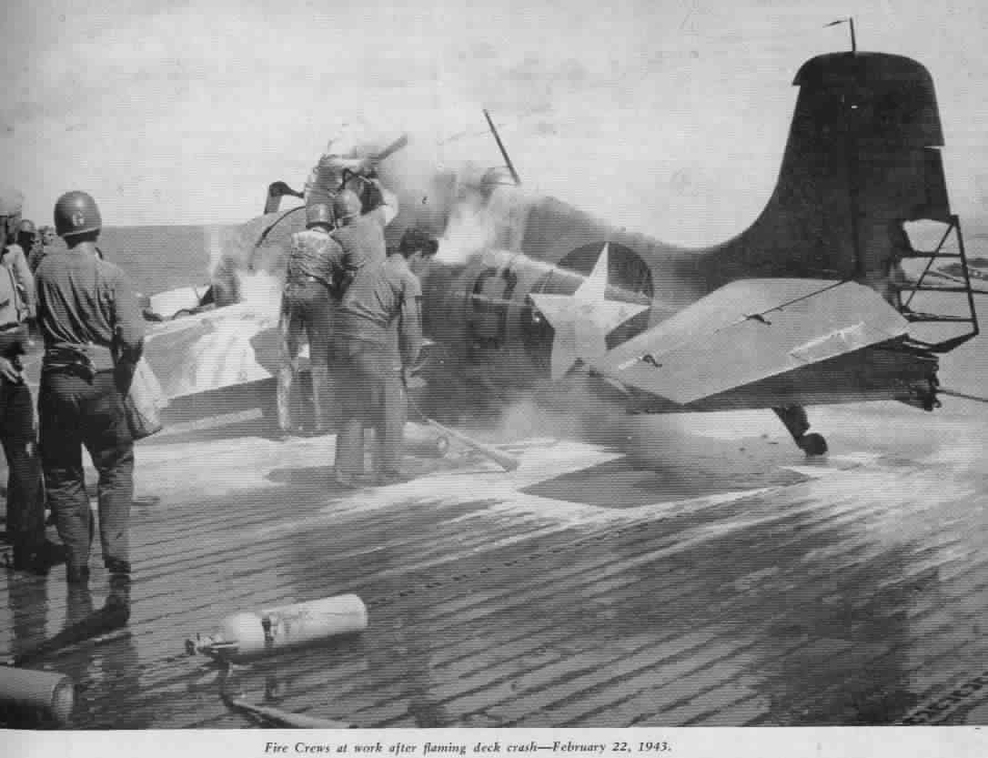 46k | Fire crews at work after flaming deck crash; February 22, 1943. | Don Schroeder | |