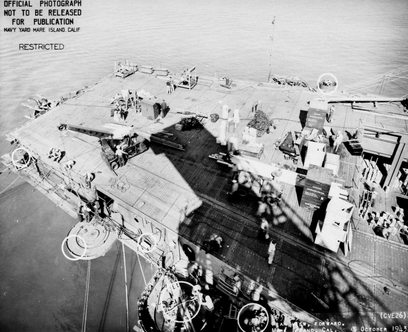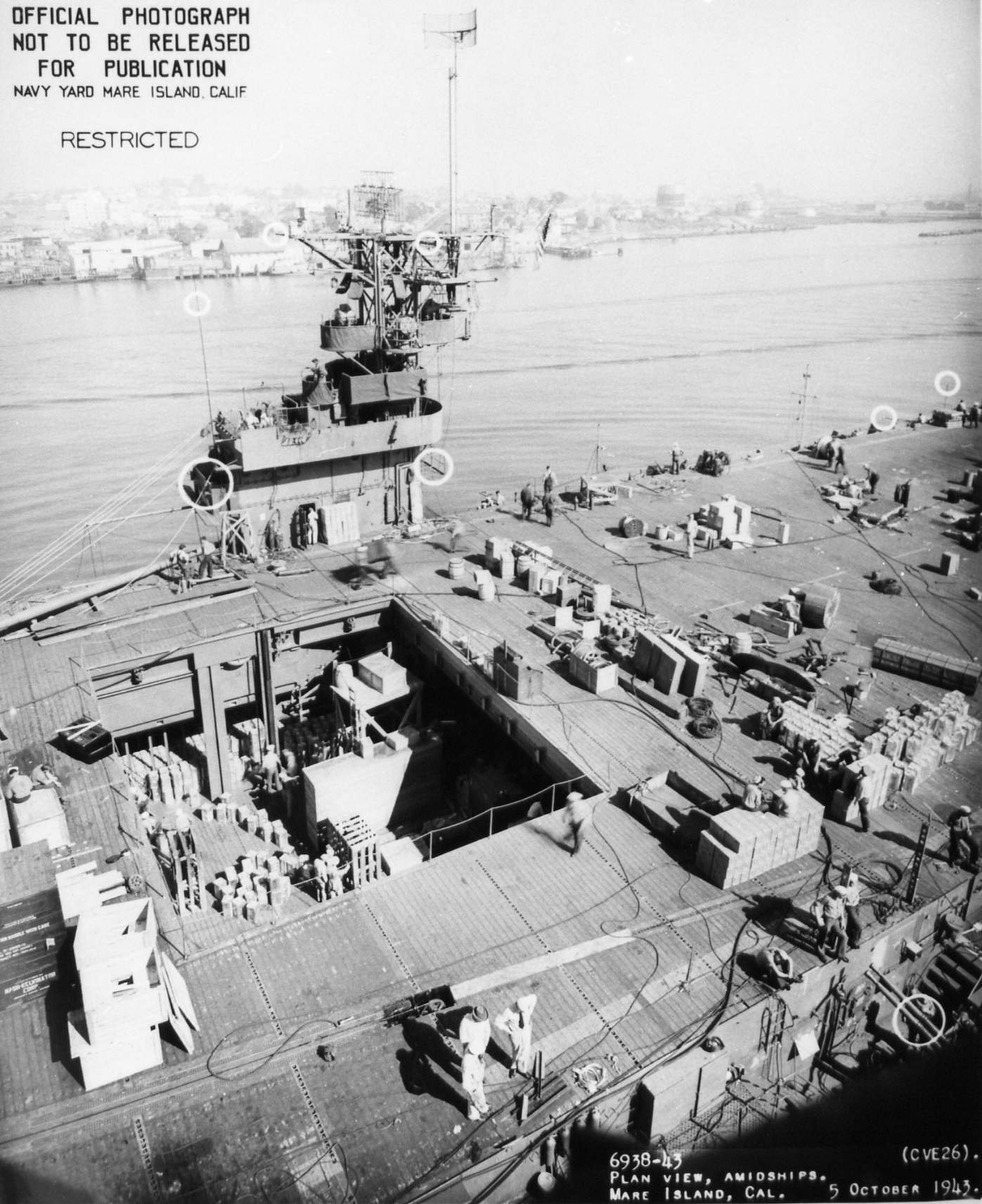 393k | Forward plan view of USS Sangamon (CVE-26) at Mare Island Navy Yard on 5 Oct 1943. She was in overhaul at the yard from 5 Sep until 6 Oct 1943. Official photo, MINY # 6937-43. | Darryl Baker | |