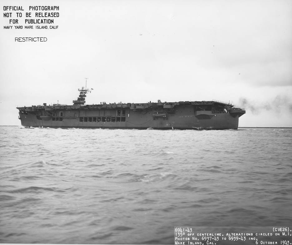 61k | USS Sangamon (CVE-26), 135° off centerline view, 6 October 1943. Official photo, Mare Island Navy Yard # 6941-43, now in the Mare Island Naval Shipyard Ship Files, San Francisco National Archives. |