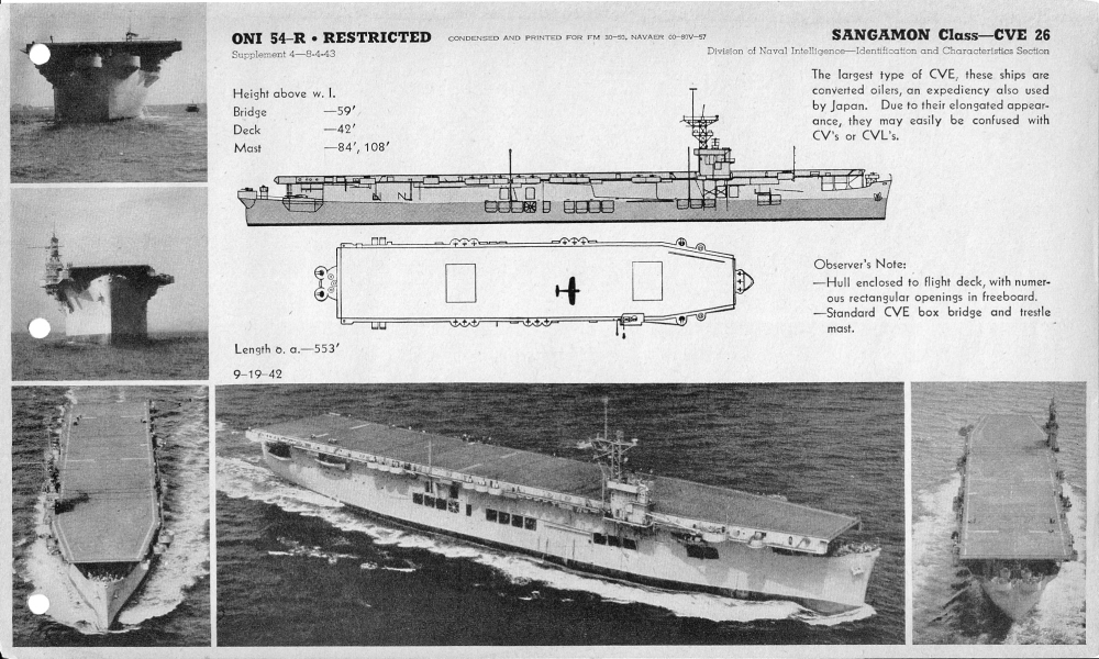 343k | Sangamon Class. From U.S. Naval Ships & Aircraft (ONI 54-R), condensed and printed for FM 30-50, NAVAER 00-80V-57 (Recognition Pictorial Manual of Naval Vessels). Supplement 4 - 4 August 1943. |