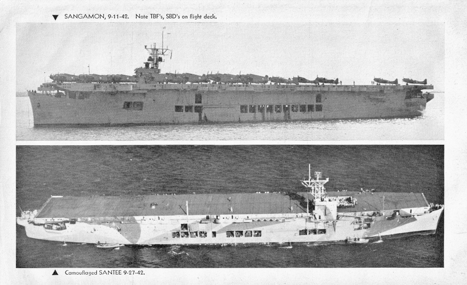 22k | USS Sangamon (ACV-26, later CVE-26), August 1942–October 1945. USS Sangamon (ACV-26), view taken from USS Ranger (CV-4) on 15 October 1942. Aircraft on deck are Douglas SBD Dauntlesses and Grumman TBF-1 Avengers. National Archives and Records Administration (NARA) photo, # 80-G-16544. |