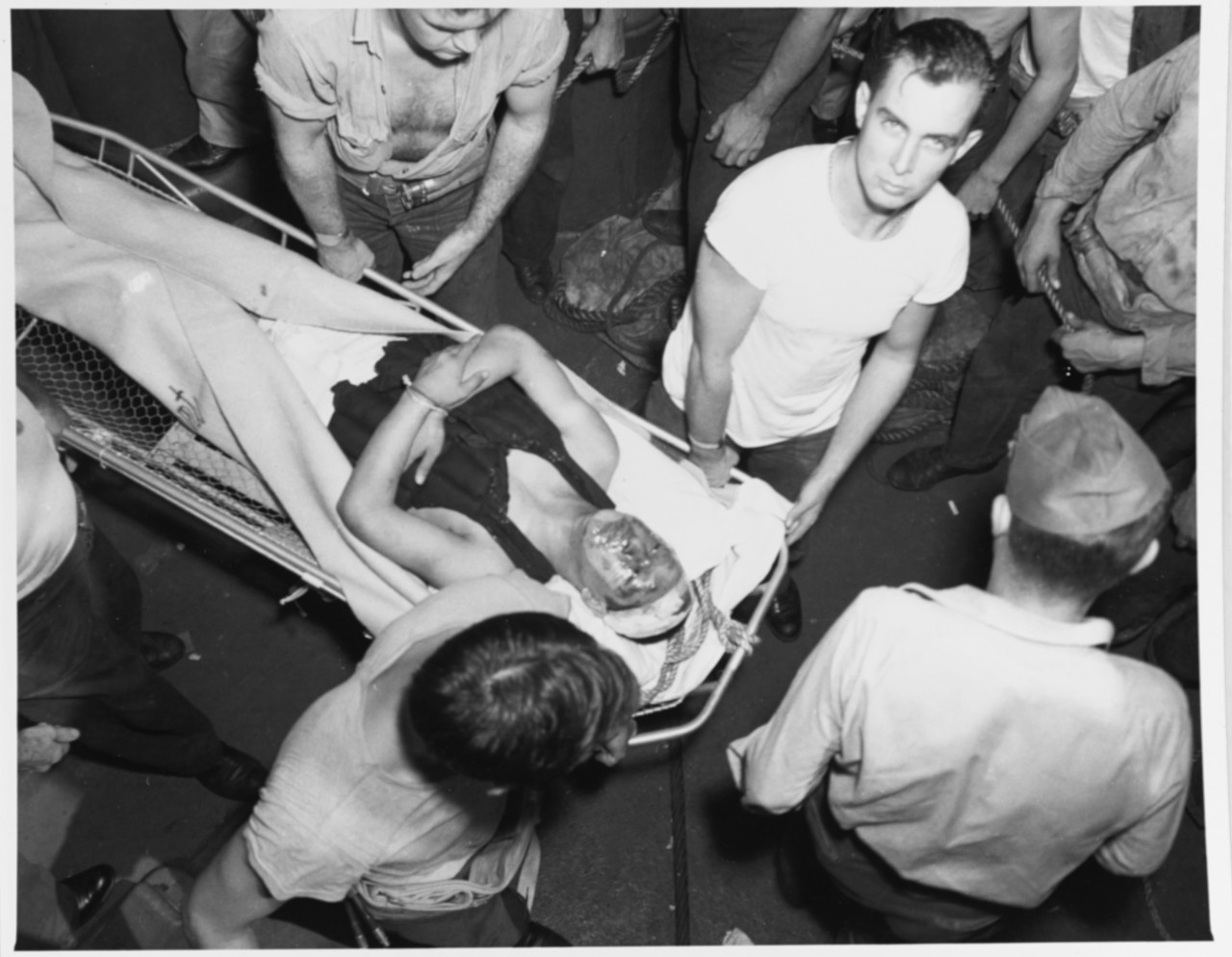 190k | The pilot of a Japanese Zeke fighter that was shot down after trying to bomb USS Sangamon (CVE-26) is transferred to the carrier's sick bay after his rescue by USS Trathen (DD-530) off Leyte, 20 October 1944. Official U.S. Navy Photograph, now in the collections of the National Archives and Records Administration (NARA), # 80-G-291260. |