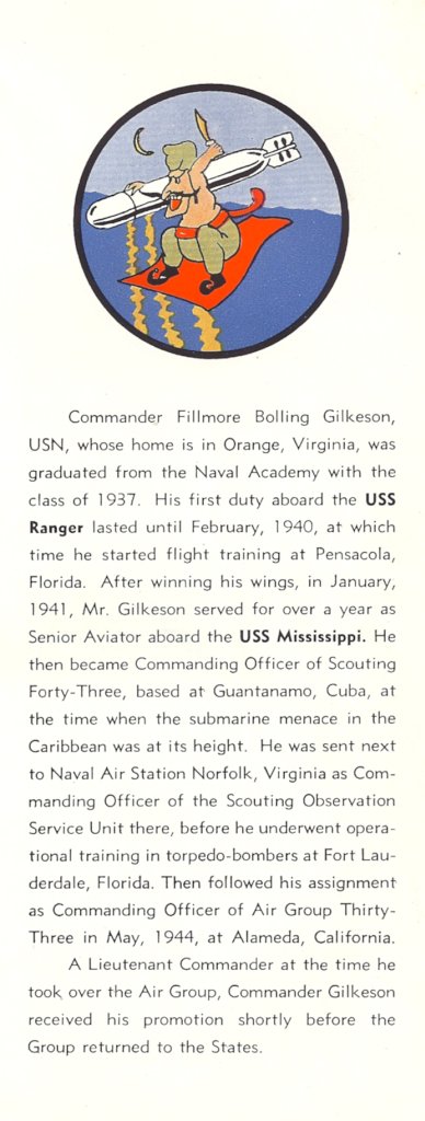 81k | "Commander Fillmore Bolling Gilkeson, USN, whose home is in Orange, Virginia, was graduated from the Naval Academy with the class of 1937. His first duty aboard the USS Ranger lasted until February, 1940, at which time he started flight training at Pensacola, Florida. After winning his wings, in January, 1941, Mr. Gilkeson served for over a year as Senior Aviator aboard the USS Mississippi. He then became Commanding Officer of Scouting Forty-Three, based at Guantanamo, Cuba, at the time when the submarine menace in the Caribbean was at its height. He was sent next to Naval Air Station Norfolk, Virginia as Commanding Officer of the Scouting Observation Unit there, before he underwent operational training in torpedo-bombers at Fort Lauderdale, Florida. Then followed his assignment as Commanding Officer of Air Group Thirty-Three in May, 1944, at Alameda, California." "A Lieutenant Commander at the time he took over the Air Group, Commander Gilkeson received his promotion shortly before the Group returned to the States." |