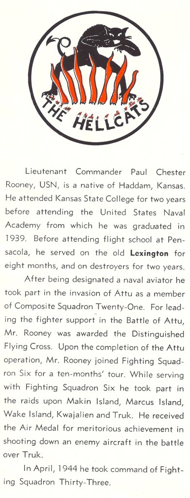 97k | "Lieutenant Commander Paul Chester Rooney, USN, is a native of Haddam, Kansas. He attended Kansas State College for two years before attending the United States Naval Academy from which he was graduated in 1939. Before attending flight school at Pensacola, he served on the old Lexington for eight months, and on destroyers for two years." "After being designated a naval aviator he took part in the invasion of Attu as a member of Composite Squadron Twenty-One. For leading the fighter support in the Battle of Attu, Mr. Rooney was awarded the Distinguished Flying Cross. Upon the completion of the Attu operation, Mr. Rooney joined Fighting Squadron Six for a ten-months' tour. While serving with Fighting Squadron Six he took part in the raids upon Makin Island, Marcus Island, Wake Island, Kwajalein and Truk. He received the Air Medal for meritorious achievement in shooting down an enemy aircraft in the battle over Truk." "In April, 1944 he took command of Fighting Squadron Thirty-Three." |