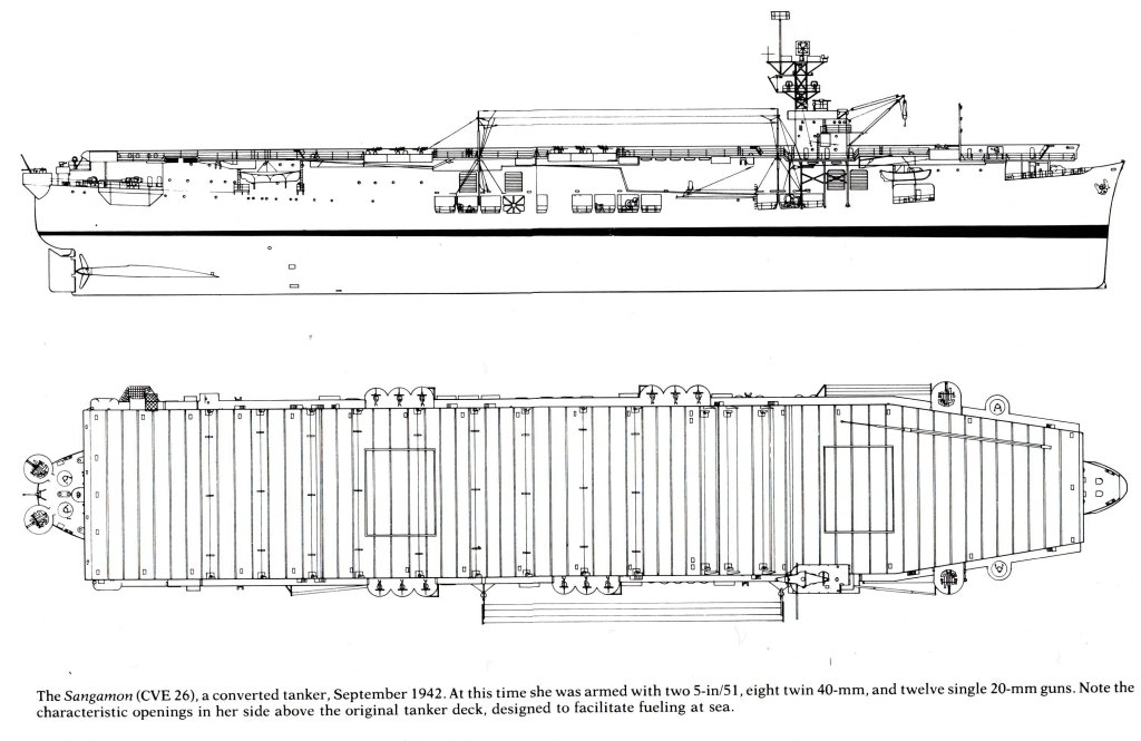 104k | The Sangamon (ACV-26), a converted tanker, September 1942. At this time she was armed with two 5-in/51, eight twin 40-mm, and twelve single 20-mm guns. Note the characteristic openings in her side above the original tanker deck, designed to facilitate fueling at sea. From U.S. Aircraft Carriers: An Illustrated Design History, by Norman Friedman. |