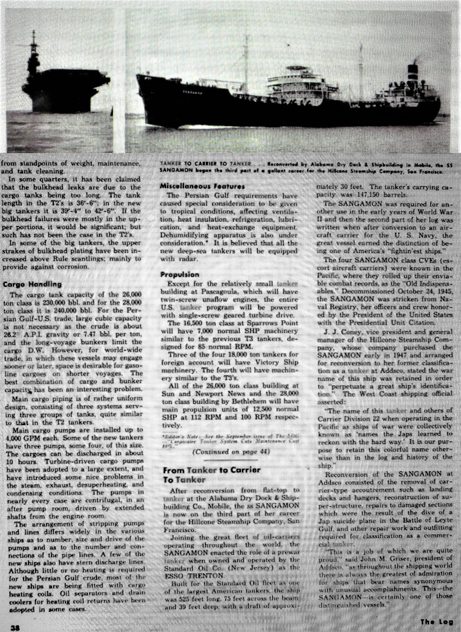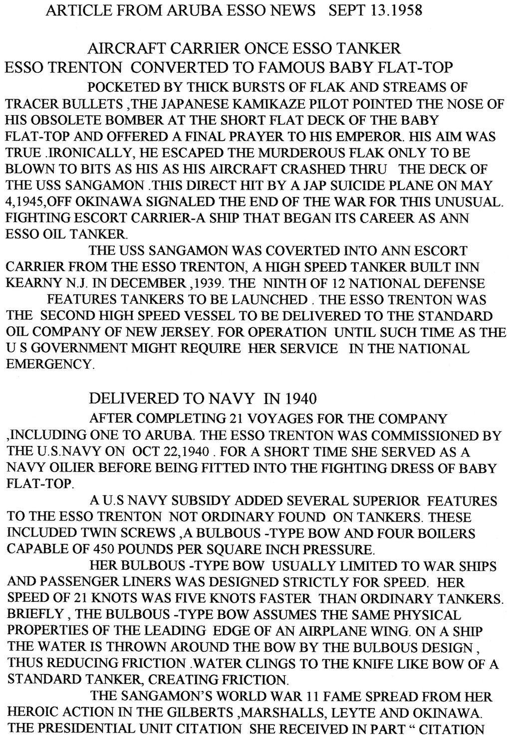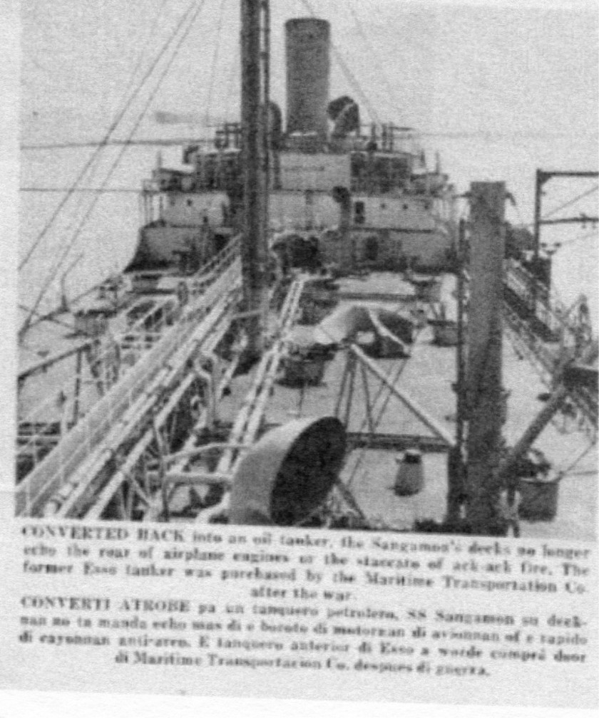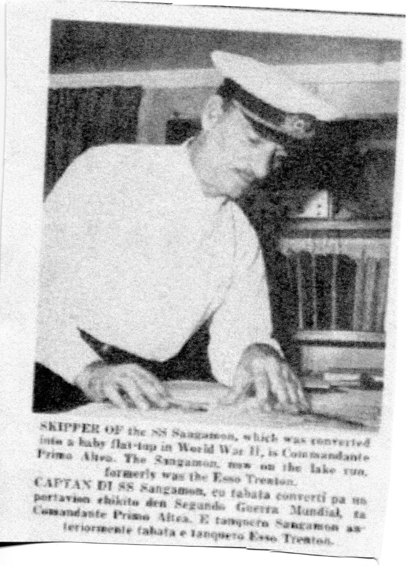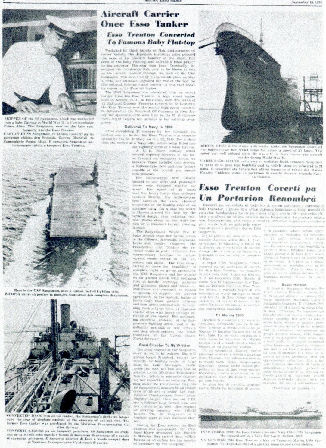 611k | Article published in the Aruba Esso News (published by Lago Oil & Transport Co., Ltd.), 13 September 1958. Don retyped the article (NS0302633–NS0302633a) to make it easier to read. NS0302633c: "SKIPPER OF the SS Sangamon, which was converted into a baby flattop in World War II, is Commandante Primo Altea. The Sangamon, now on the lake run, formerly was the Esso Trenton." NS0302633d: "CONVERTED BACK into an oil tanker, the Sangamon's decks no longer echo the roar of airplane engines or the staccato of ack-ack fire. The former Esso tanker was purchased by the Maritime Transportation Co. after the war." |