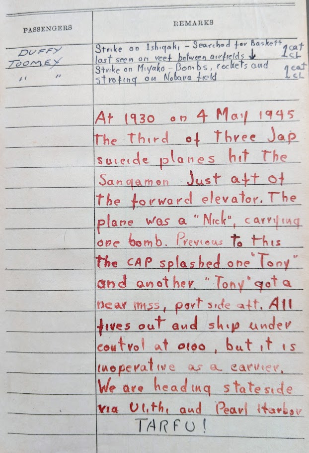 211k | LT Howard Scott Young, Jr., was a pilot in VT-33 aboard USS Sangamon (CVE-26). NS0302637: LT Young in his TBM-3E Avenger, "Nancy III." NS0302637a: LT Young's log entry, 4 May 1945 (the day Sangamon was attacked by kamikazes). |