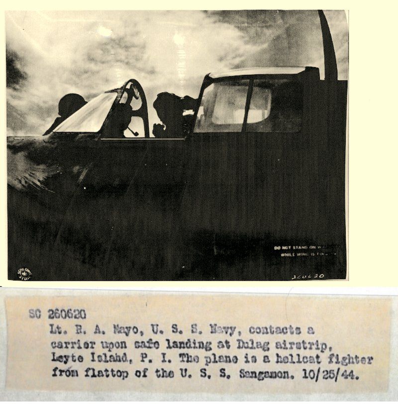 111k | "SC 260620" "Lt. R[obert] A. Mayo, U.S.S. [sic] Navy, contacts a carrier upon safe landing at Dulag airstrip, Leyte Island, P. I. The plane is a Hellcat fighter from flattop of the U.S.S. Sangamon. 10/25/44." |