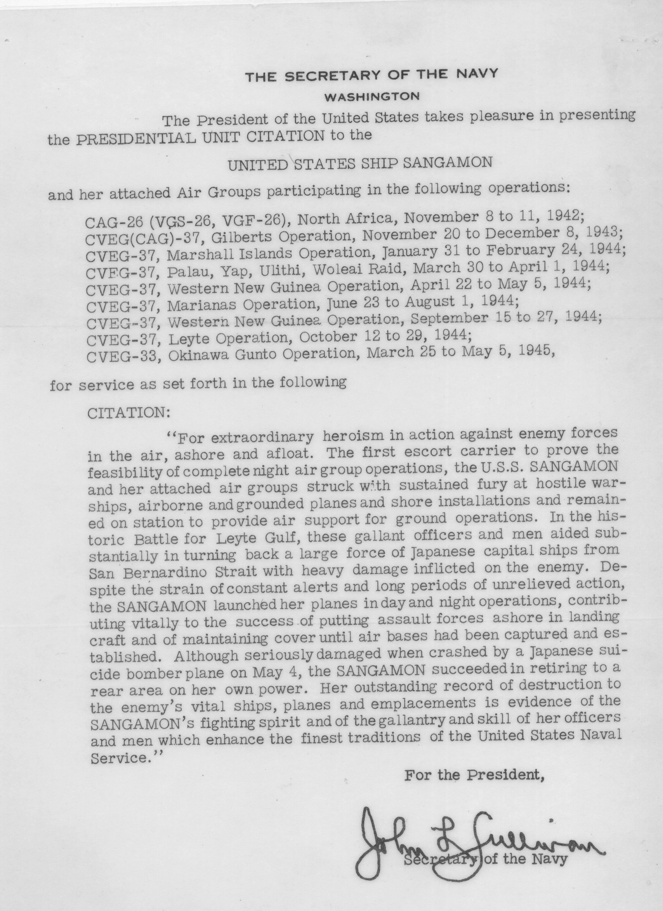 "For extraordinary heroism in action against enemy forces in the air, ashore and afloat. The first escort carrier to prove the feasibility of complete night air group operations, the U.S.S. SANGAMON and her attached air groups struck with sustained fury at hostile warships, airborne and grounded planes and shore installations and remained on station to provide air support for ground operations. In the historic Battle for Leyte Gulf, these gallant officers and men aided substantially in turning back a large force of Japanese capital ships from San Bernardino Strait with heavy damage inflicted on the enemy. Despite the strain of constant alerts and long periods of unrelieved action, the SANGAMON launched her planes in day and night operations, contributing vitally to the success of putting assault forces ashore in landing craft and of maintaining cover until air bases had been captured and established. Although seriously damaged when crashed by a Japanese suicide bomber plane on May 4, the SANGAMON succeeded in retiring to a rear area on her own power. Her outstanding record of destruction to the enemy's vital ships, planes and emplacements is evidence of the SANGAMON's fighting spirit and of the gallantry and skill of her officers and men which enhance the finest traditions of the United States Naval Service." |