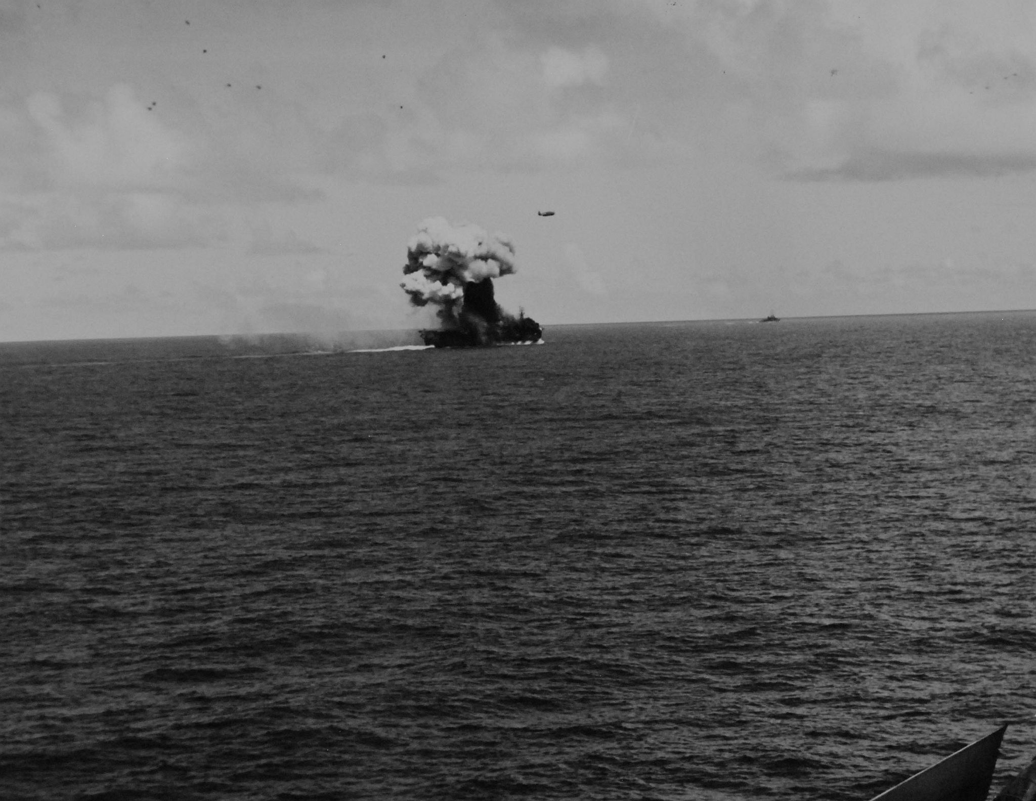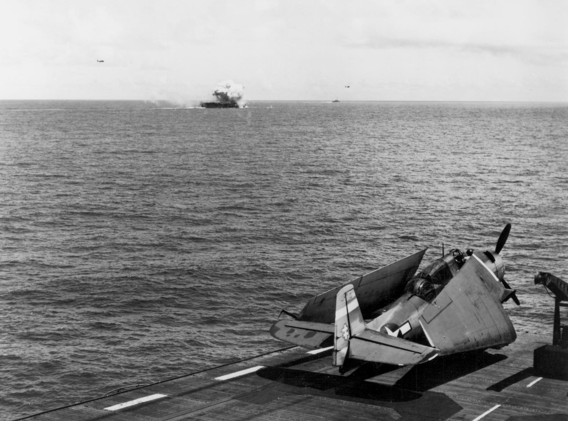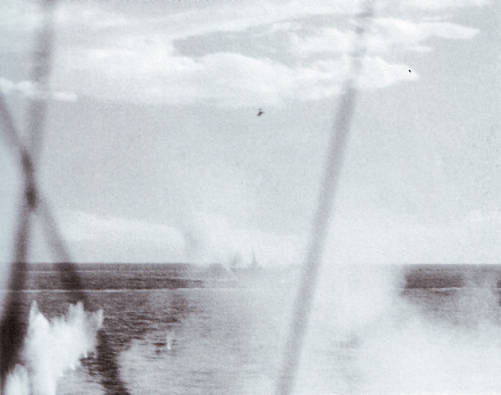 1.33M | Air Raids in the Pacific, 1 July 1945. Explosion in the background resulted from a carrier-plane strike on Balikpapan, Borneo. Photographed by USS Suwannee (CVE-27) aircraft. U.S. Navy photograph, now in the collections of the National Archives and Records Administration (NARA), # 80-G-349247. |