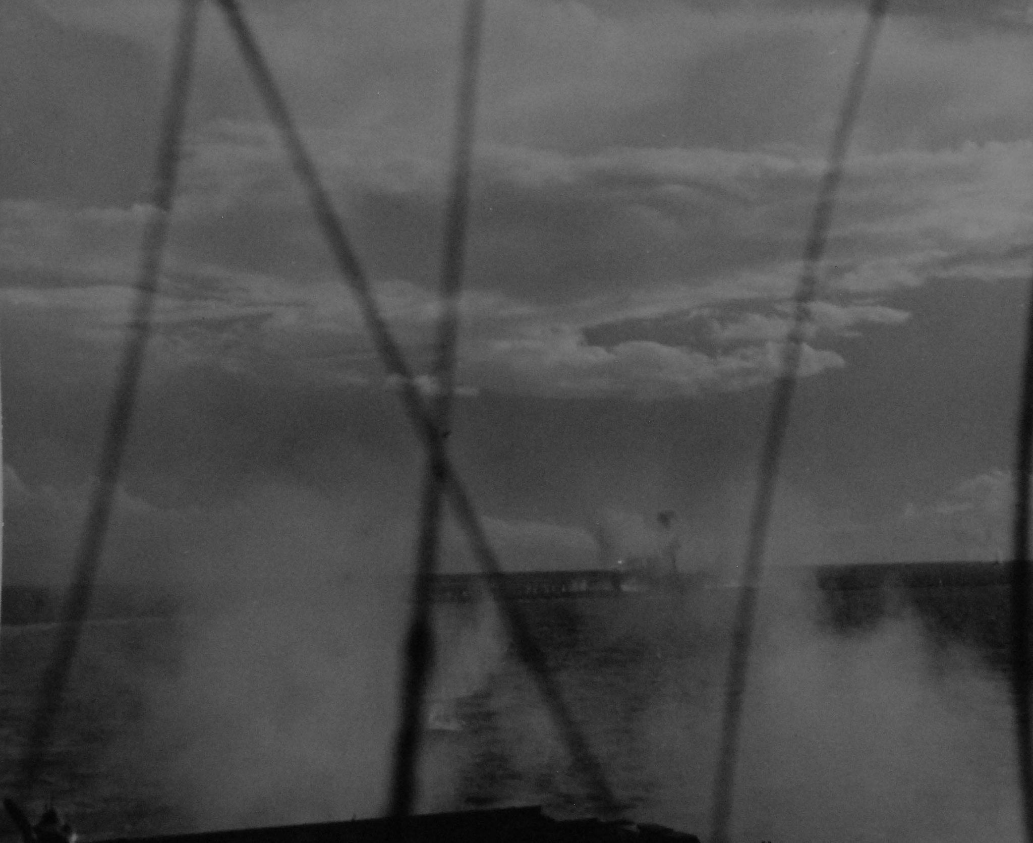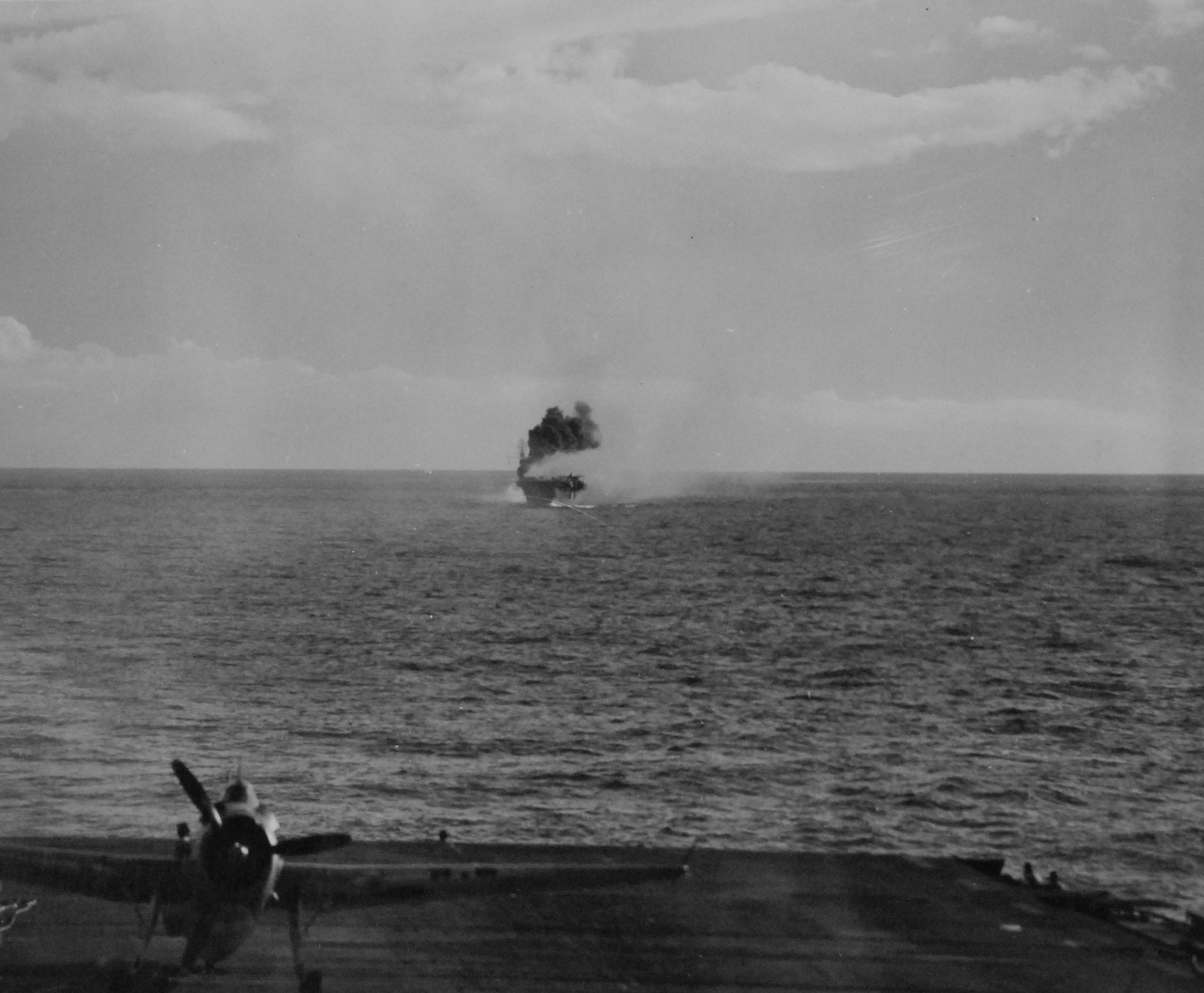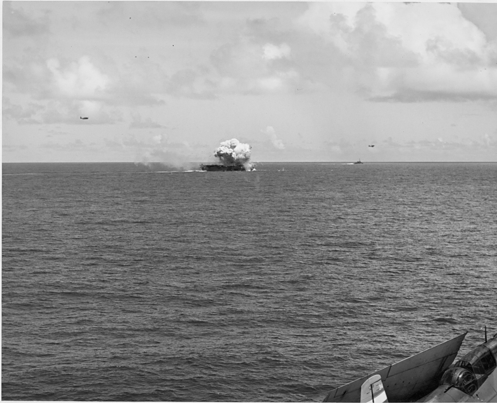 1.33M | Air Raids in the Pacific, 1 July 1945. Explosion in the background resulted from a carrier-plane strike on Balikpapan, Borneo. Photographed by USS Suwannee (CVE-27) aircraft. U.S. Navy photograph, now in the collections of the National Archives and Records Administration (NARA), # 80-G-349247. |