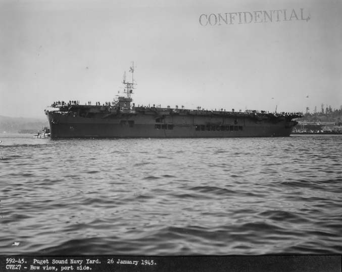 (CVE-27) underway at 17 knots, after repairs from the Kamikaze attacks of October 1944.