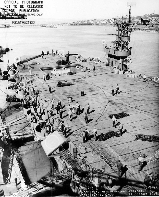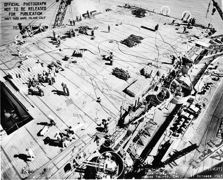 162k | Amidships looking aft plan view of USS Suwannee at Mare Island Navy Yard on 11 Oct 1943. Circled areas indicated additions or modifications at the shipyard between 11 Sep to 12 Oct 1943. U.S. Navy photo, Mare Island Navy Yard # 7045-43. | Darryl Baker | |