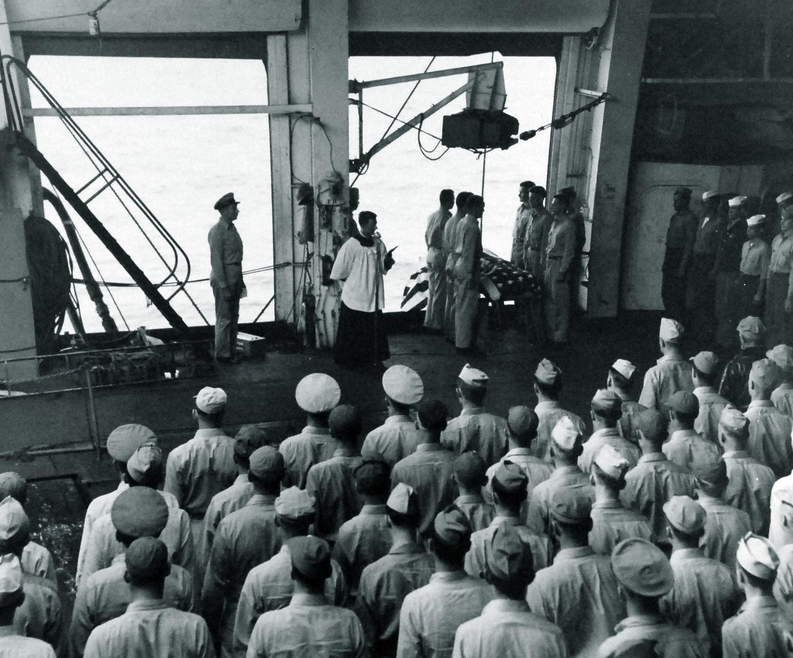 407k | Lieutenant Edmond C. Walsh, ChC, USNR, conducting burial services aboard USS Suwannee (CVE-27) while at sea for Lieutenant Junior Grade Obed F. Flingerland, USNR, who was killed when a 100-pound bomb in bomb bay of his TBM-3 Avenger exploded when he was making a landing on the carrier. Photographed by Chief Photographer's Mate V. Webb, 24 May 1945. National Archives and Records Administration (NARA) photo, # 80-G-325110. |