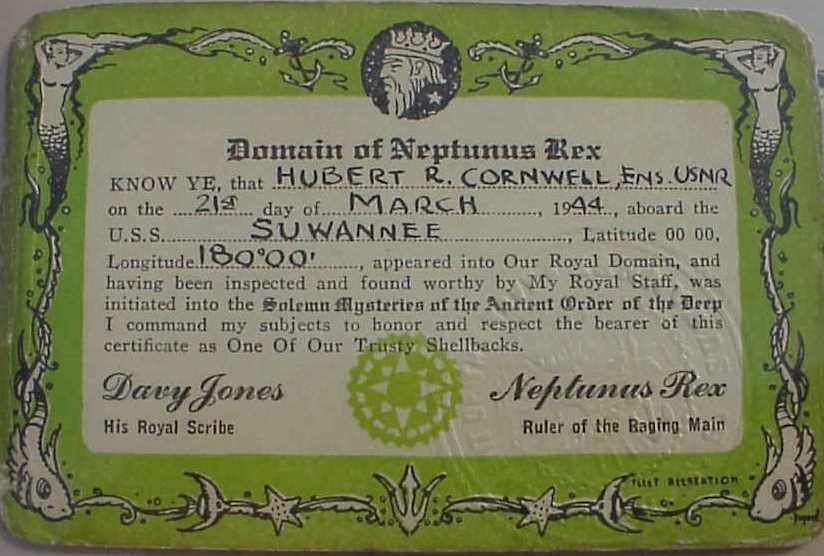 71k | Shellback Certificate for ENS Hubert R. Cornwell, USNR, 21 March 1944. | Tommy Trampp | |