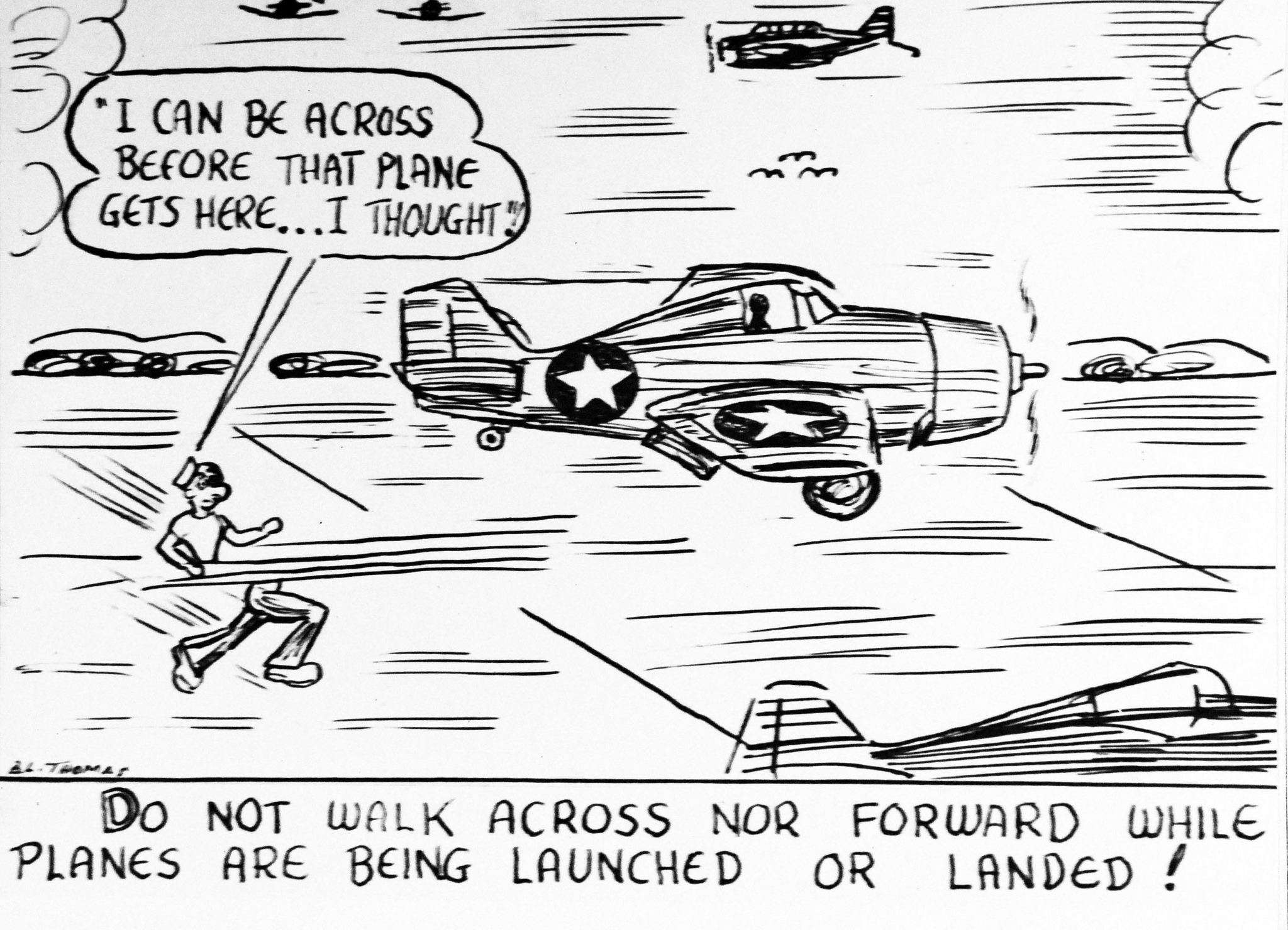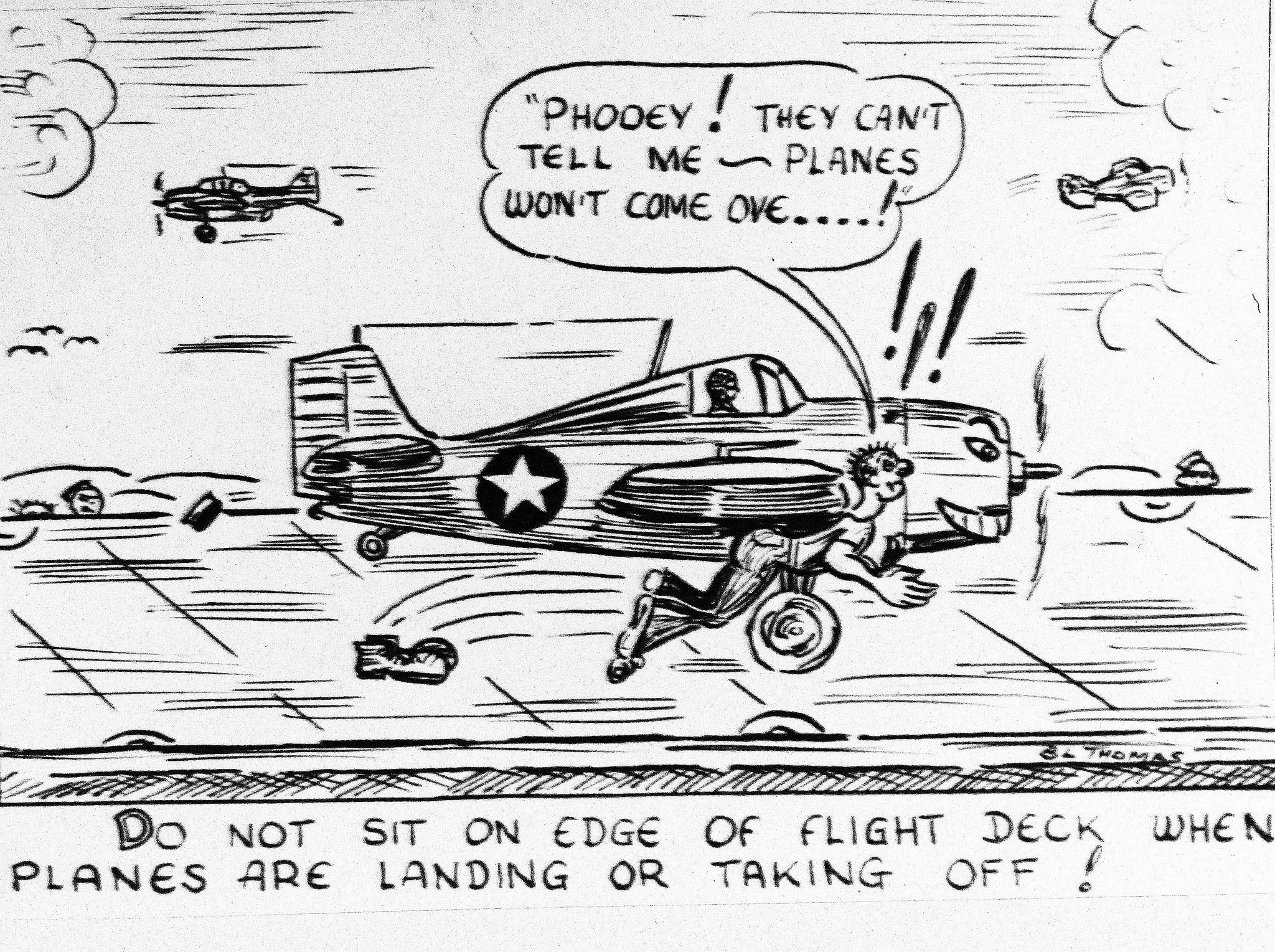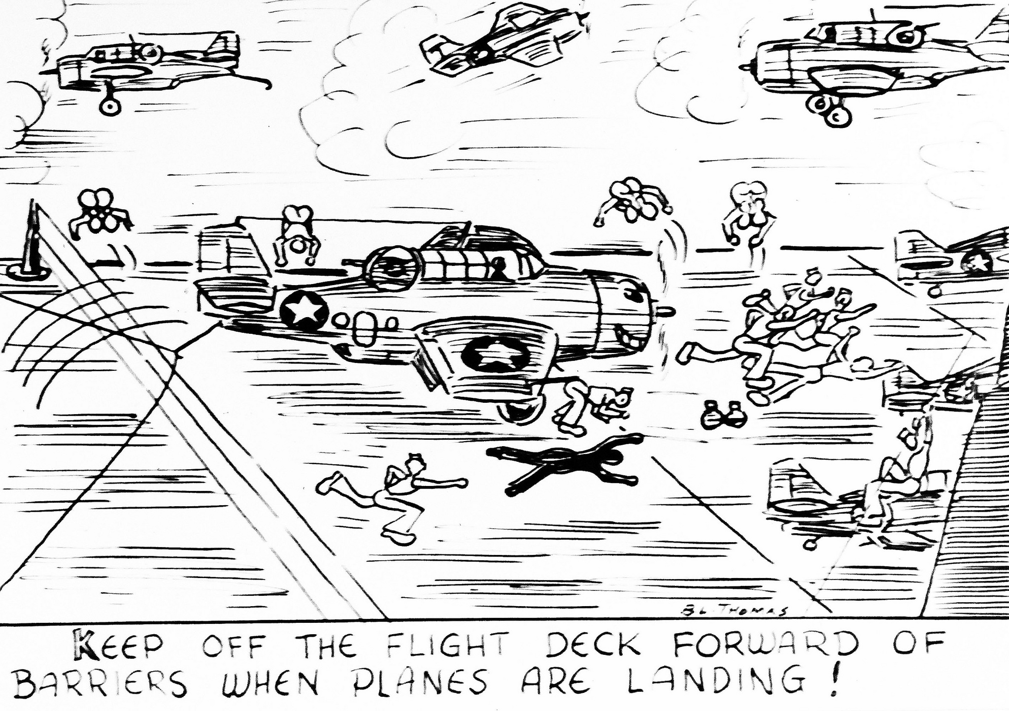 955k | Flight deck poster made by an AMM, B.L. Thomas, of the crew. Artwork details about crossing the flight deck during landings. Photograph: 7 April 1943. Official U.S. Navy photograph, now in the collections of the National Archives and Records Administration (NARA), photo # 80-G-39317. |