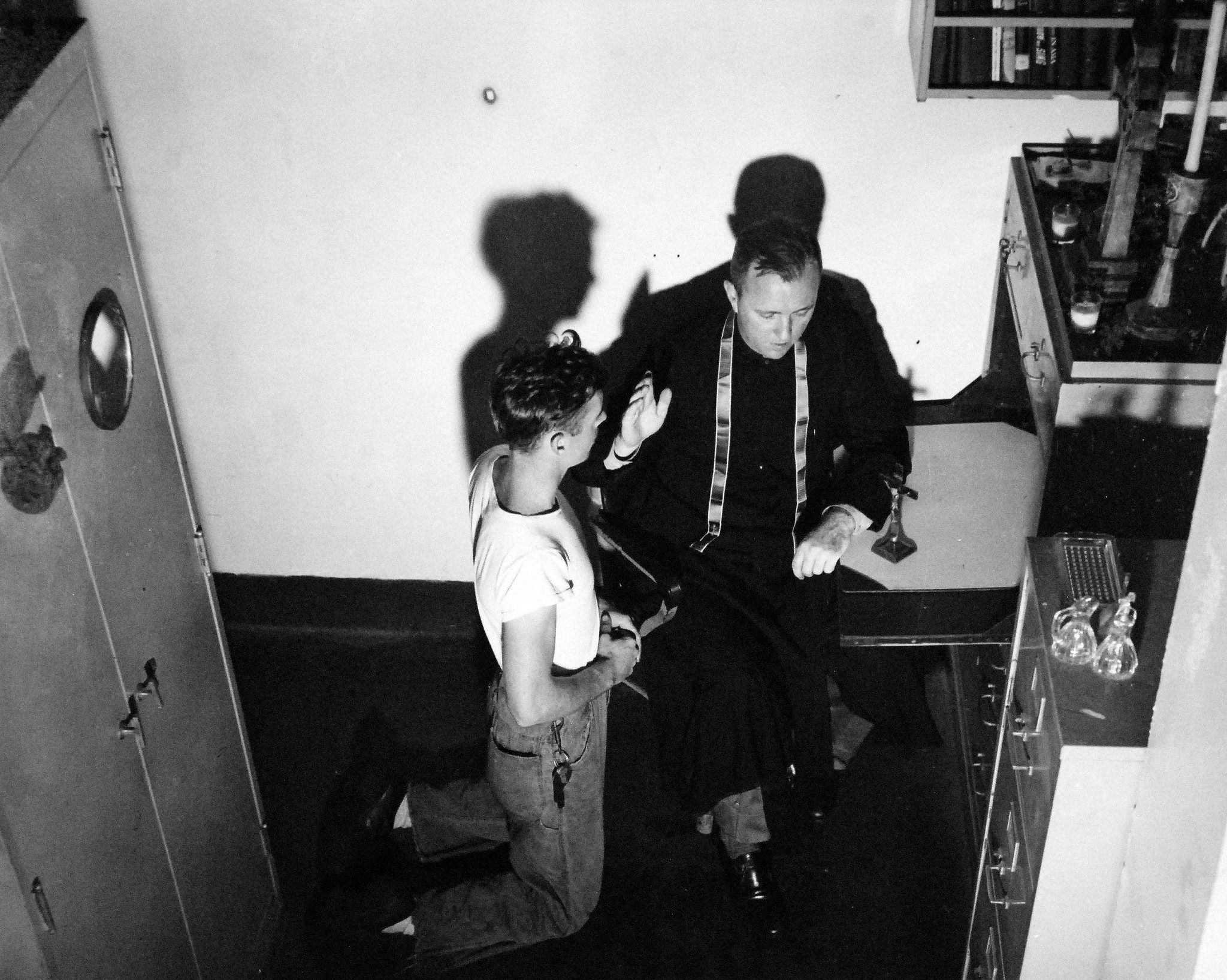656k | Aboard USS Suwannee (CVE-27), Lieutenant Edward P. Looney, a Catholic Chaplain, listens to confessions of a crew member. Photograph released 4 August 1945. U.S. Navy photograph, now in the collections of the National Archives and Records Administration (NARA), # 80-G-349243. |