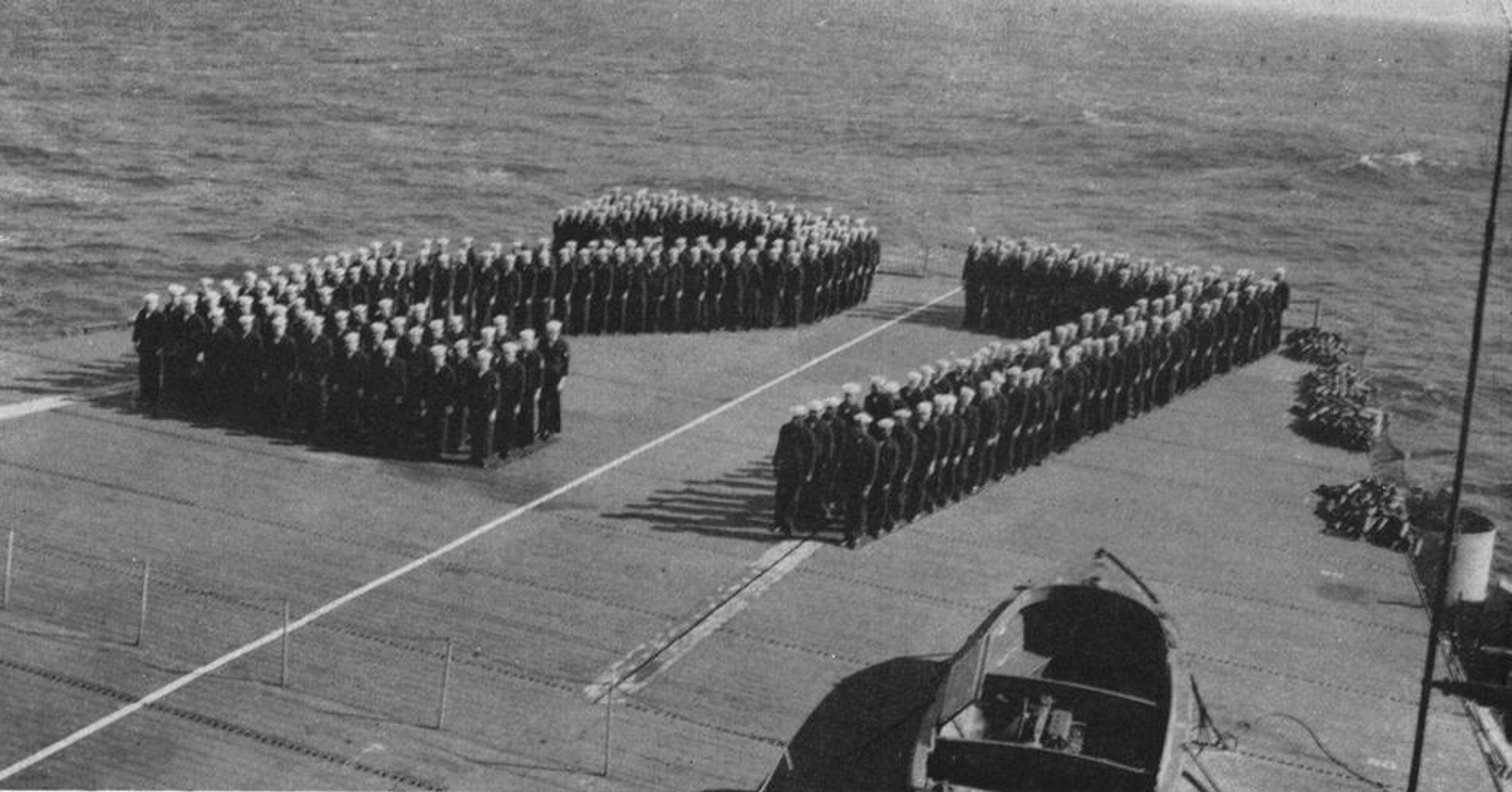 520k | Crewmembers of the U.S. Navy escort carrier USS Suwannee (CVE-27) form the ship's hull number on the flight deck, circa 1944. U.S. Navy photo from the Suwannee 1942–1945 Cruise Book. |