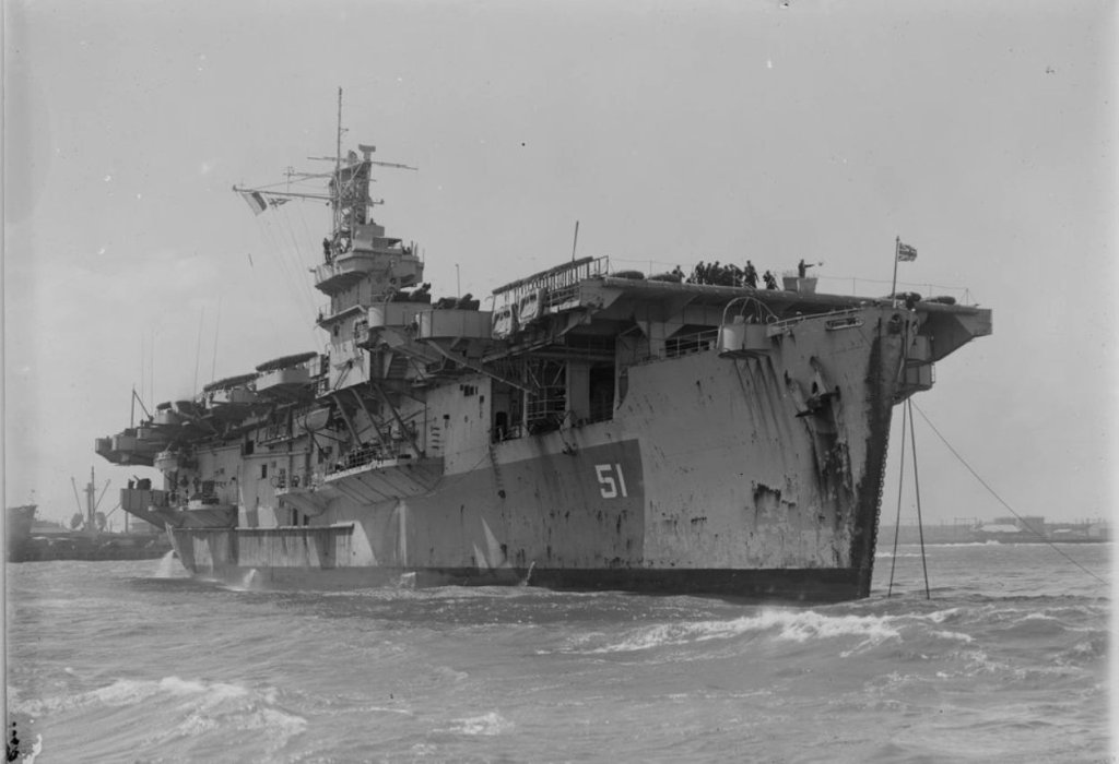 72k | HMS Atheling (D51), ex-Glacier (CVE-33), departing Malta (early 1944?). |