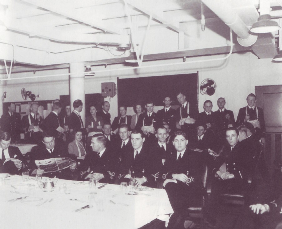 118k | Undated pic of the RN officer's wardroom aboard HMS Atheling. The presence of ladies shows that the ship is in port. Photo via the late Mrs M.J. Schupke. Photo and text from The Fleet Air Arm Handbook, 1939–1945, by David Wragg. |