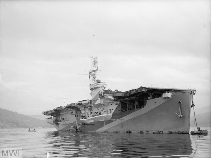 99k | HMS Speaker (D90), formerly Delgada (CVE-40), astern of HMS Indefatigable in March or April of 1945. During that time, Speaker was tasked with providing air cover during ship-to-ship refueling operations with Hellcat Mk IIs flown by 1840 Naval Air Squadron. US Navy photo now in the collection of the US National Archives, College Park, Maryland (80-G-316332). |