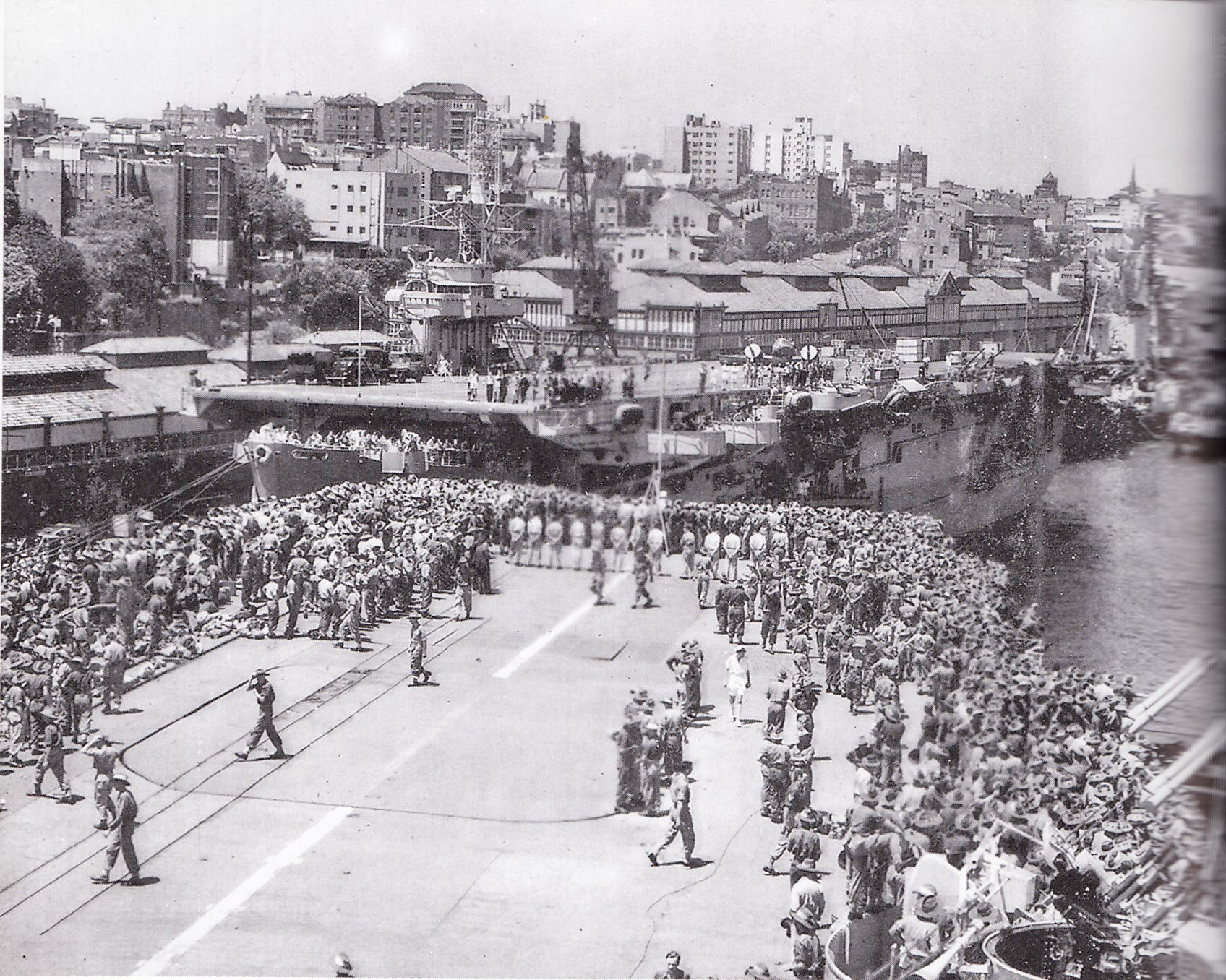 513k | HMS Implacable (R5) coming in to berth in the eastern suburb of Woolloomooloo, Sydney, NSW., with Australian troops on deck. HMS Speaker (R314) is moored alongside ahead of her. Photo Author's Collection. Image scanned from The British Pacific Fleet: The Royal Navy's Most Powerful Strike Force, by David Hobbs (Seaforth Publishing). |