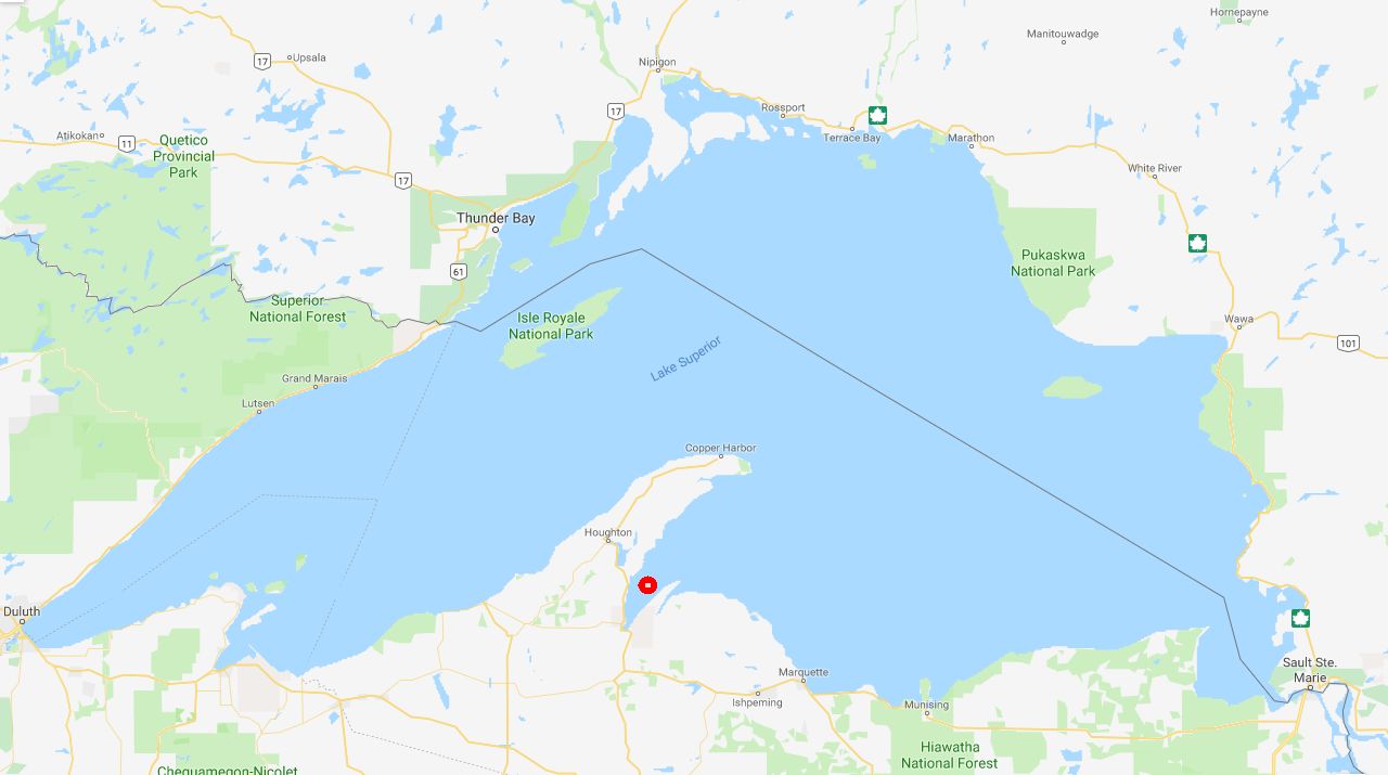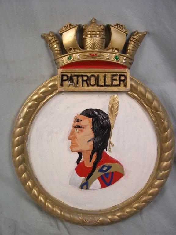 75k | ACV-44 (later CVE-44) was named Keweenaw Bay for a bay of Lake Superior along the northern shore of the upper peninsula of Michigan (NS0304408, map courtesy of Google Maps). Assigned to the United Kingdom, 10 June 1943, and transferred under Lend-Lease on 22 October of the same year, she was renamed Patroller. A "Patroller" is an individual who walks or goes around or through an area, building, etc., to make sure that it is safe. The coat of arms was suggested by the ship's officers and possibly depicts a Chippewa Indian brave, since the Chippewas (also known as Ojibwe, Ojibwa, or Saulteaux) live in the L'Anse Indian Reservation in Keweenaw Bay, the original name of the ship (blazon courtesy of Tommy Trampp). |