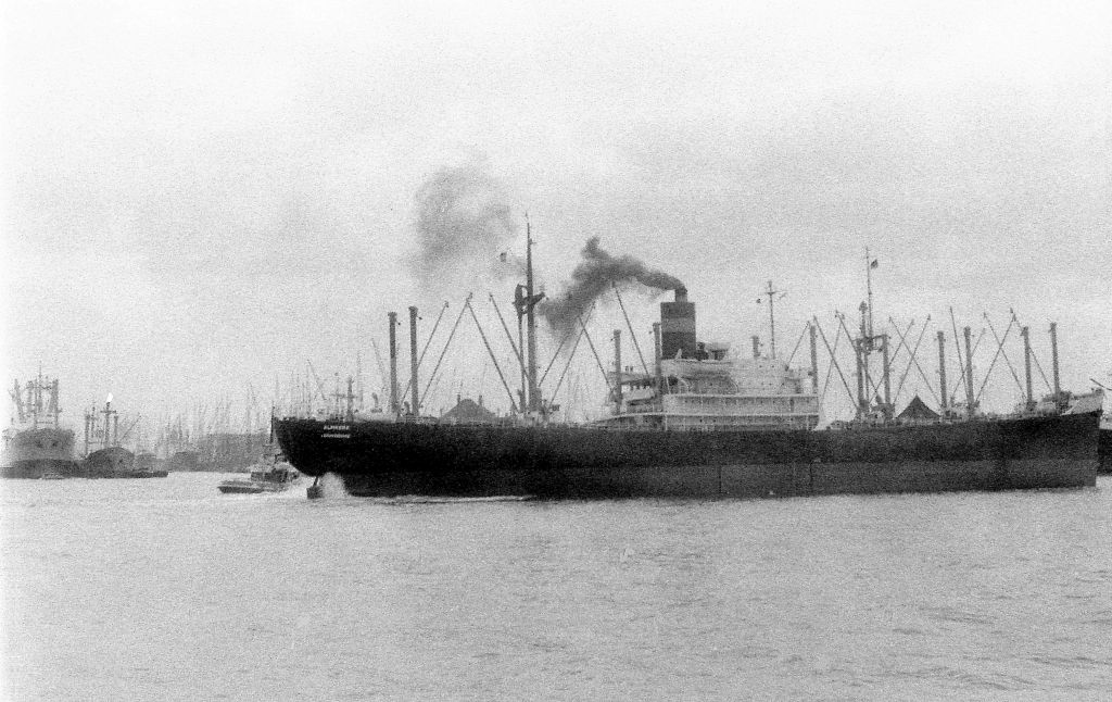 148k | Ex-Keweenaw, ex-HMS Patroller, as the Dutch Almkerk, being maneuvered by tugs in the port of Hamburg, Germany, 1965. |