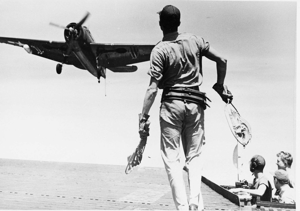in landing, due to tail hook breaking off, on the USS Coral Sea (CVE-57). National Archives photo (# 80-G-86021). |
