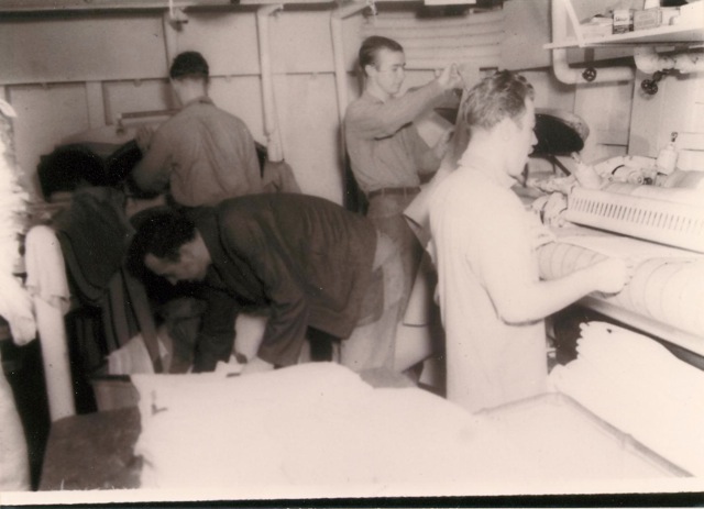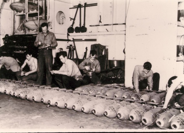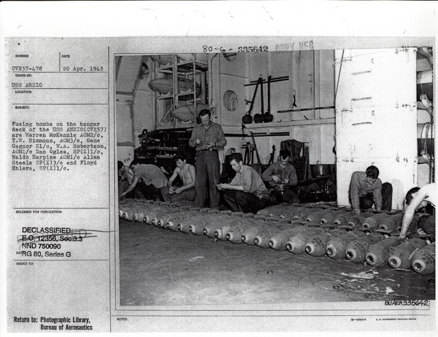 125k | "Fusing bombs on the hangar deck of the USS Anzio (CVE-57) are Warren McKenzie AOM2/c, T.W. Simmons, AOM3/c, Gene Gagnor, S1/c, W.A. Robertson, AOM1/c Dan Ogles, SP(X)1/c, Waldo Harpine AOM1/c Allen Steele SP(X)3/c and Floyd Ehlers, SP(X)1/c." Photo # CVE57-478, dated 20 April 1945. National Archives photo (# 80-G-335642). |