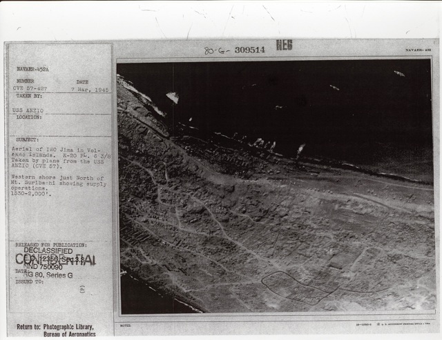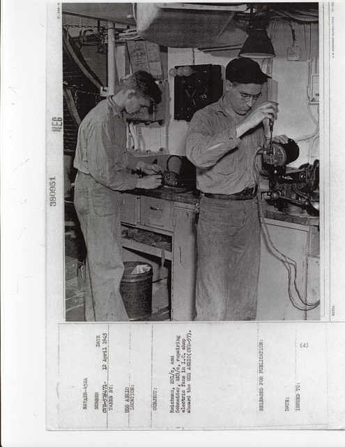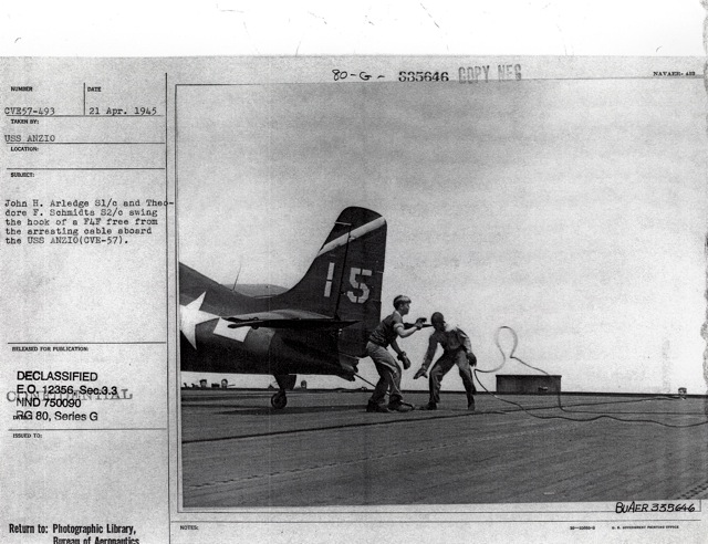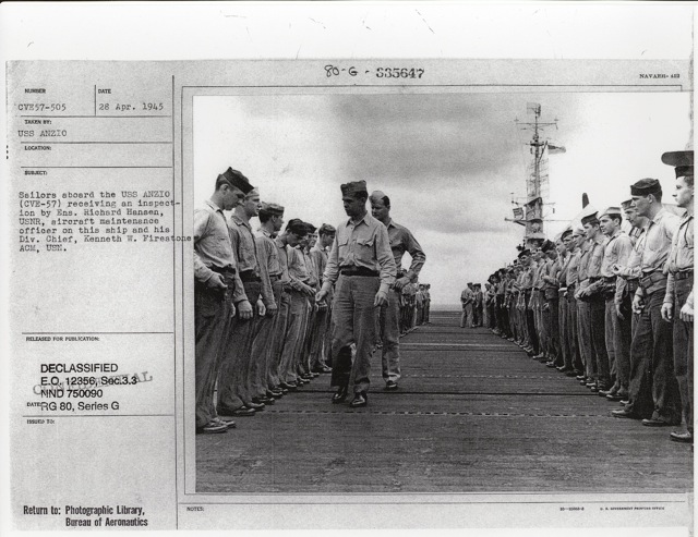116k | "Sailors aboard the USS Anzio (CVE-57) receiving an inspection by Ens. Richard Hansen, USNR, aircraft maintenance officer on this ship and his Div. Chief, Kenneth W. Firestone, ACM, USN." Photo # CVE57-505, dated 28 April 1945. National Archives photo (# 80-G-335647). |