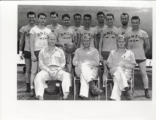 119k | Basketball team, USS Anzio. Over two years, undefeated. Front row (l to r): Dunn, athletic officer; CAPT Montgomery, CO; Davis, XO. Middle row (l to r): Quick; Amstead, Capt. of team; Russell; Stevens; Baldwin. Back row (l to r): Napolitano; Dunigan; Silcox; Kelly; Stewart. Remark: Note that the name of the man second from left, back row, is misspelled as "Donagan" in the original, handwritten annotation. However, William J. Dunigan IV has identified his father, William James Dunigan, and has informed us of the correct spelling (thank you, William). |