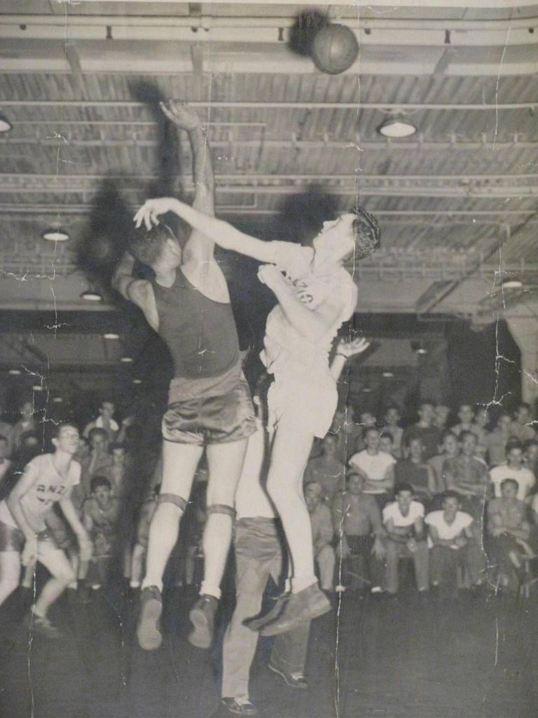 78k | S1/C (AOM) William James Dunigan—Jimmy Dunigan, as he went by his middle name—,the same guy in the back row in the team picture, playing for USS Anzio, and trying to block a shot while in a game with USS Monterey. Anzio won 26 to 24. Does anyone know if Gerald Ford, an accomplished athlete himself, played on the Monterey team that day? |