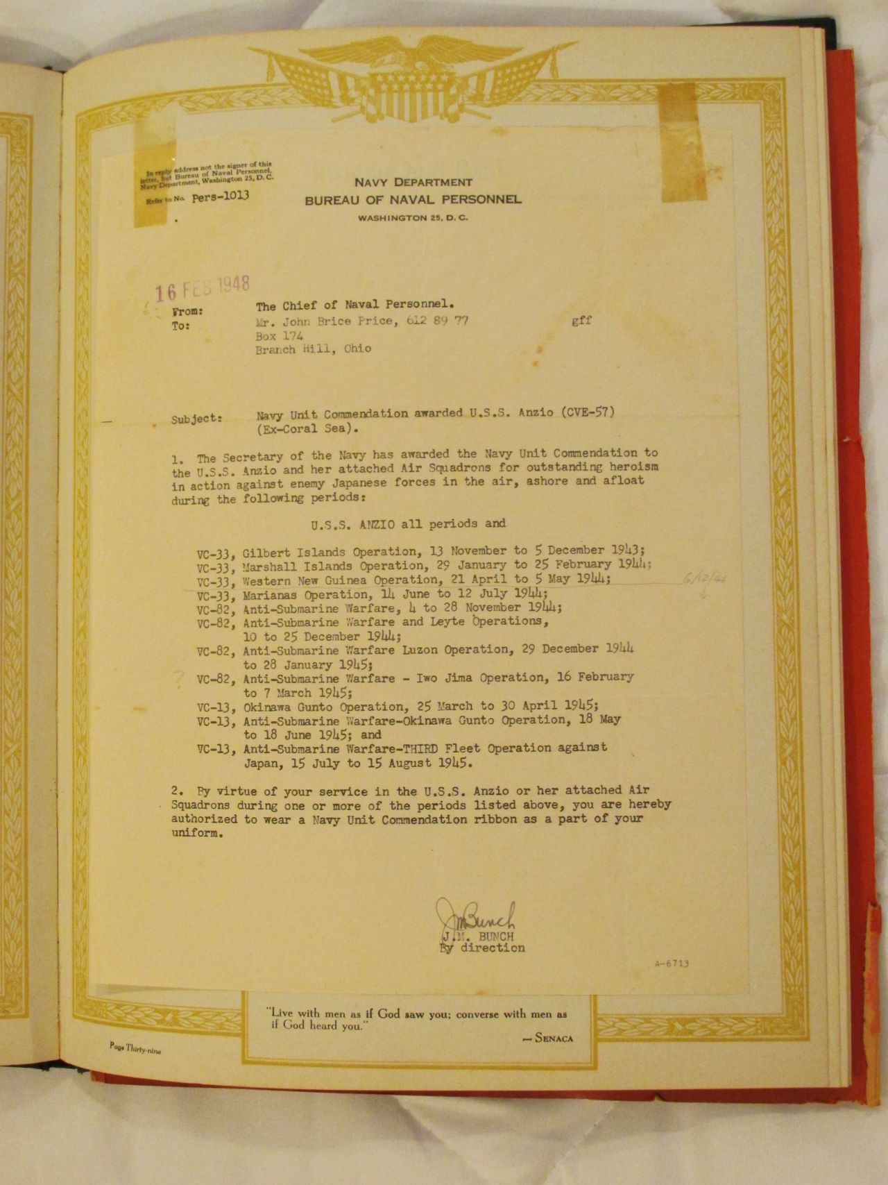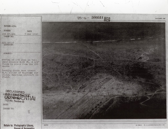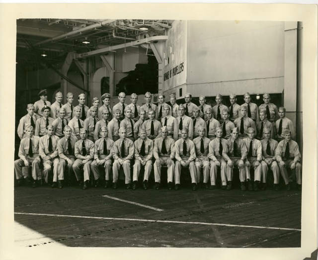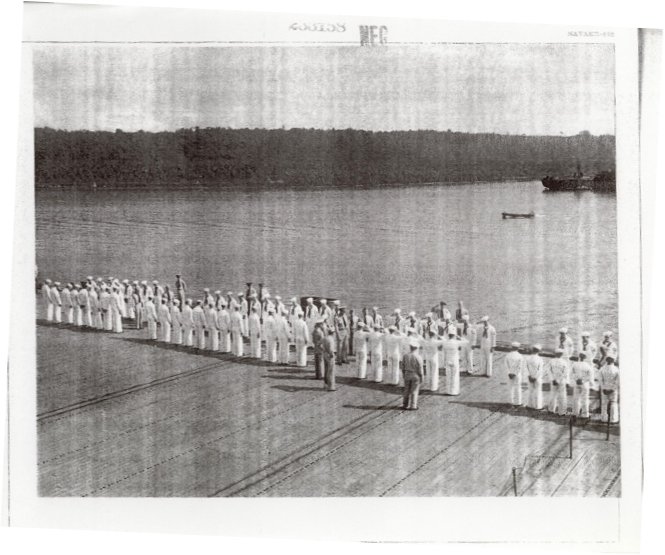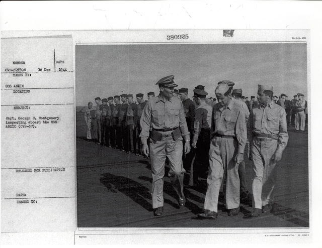 104k | "Capt. George C. Montgomery USN shaking hands with the Key men who keep the flight and hangar deck of the USS Anzio (CVE57) clicking smoothly (l-r) Lt. Robert L. Thornton, Ens. Richard T. Hansen, Charles J. Mohler, AMM/1c, Maurice P. Murphy, Cox, John Stefanou, ACMM, Elija R. Murry, Mach., Frank Sinore, AMM2/c, Tolson W. Linch, AMM3/c, and Charlie P. Jennings, BM/2c." Photo # CVE57-526, dated 23 May 1945. National Archives photo (# 80-G-335650). |