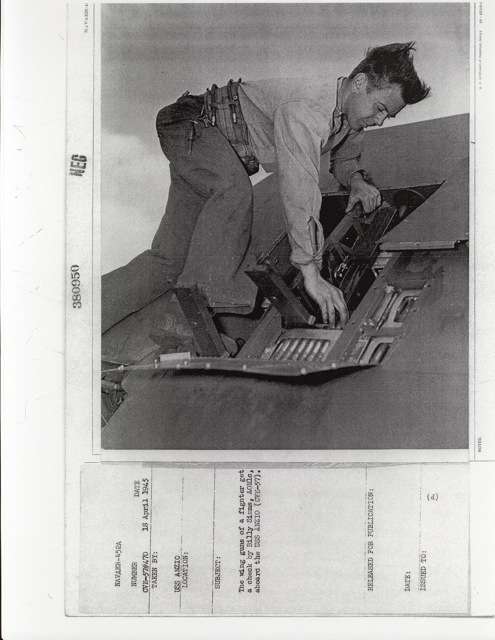 98k | "Frank Stanley, S1/c, cleaning a 20mm gun aboard the USS Anzio (CVE-57)." Photo # CVE-57#473, dated 19 April 1945. National Archives photo (# 80-G-380952). |