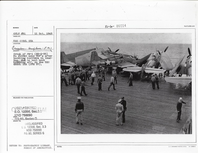 98k | "Crash of FM-1 (33-S-35) Bu #15345 amid TBF's after hurdling barriers in landing, due to tail hook breaking off, on the USS Coral Sea (CVE-57)." Photo # CRLS 31, dated 11 October 1943. National Archives photo (# 80-G-86014). |