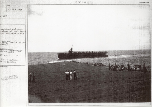252k | Escort carriers practicing division formation and maneuver exercises, in Hawaiian waters, 13 January 1944. As seen from USS Manila Bay (CVE-61), ships astern are: Coral Sea (CVE-57), Corregidor (CVE-58), Natoma Bay (CVE-62), and Nassau (CVE-16). These carriers all served in the Marshalls Operation a few weeks later. Source: United States National Archives and Records Administration (NARA), photo No. 80-G-214849. |